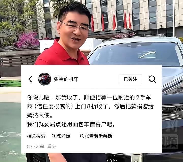 陈光标做的最后悔的一件事,估计就是好心给张雪送豪车,结果反手被卖做慈善了,这种事情发生在任何人身上,都不会轻易能接受的。 张雪的摩托车夺冠后,陈光标为其准备了一辆价值1300万的劳斯莱斯,作为张雪的接待车,本来是一番好意,结果张雪回应时,表示可以收下,但是他要把车以8折的价格卖给二手车商,然后把钱捐给嫣然天使基金。 好家伙,这可不是陈光标的意思,送车是给张雪个人的,而不是让他做慈善,陈光标无奈,只能回应张雪误会了自己的初心,不久,陈光标又把前面的回应删除,之后表示尊重和支持张雪的决定。 这样的举动,可以看出陈光标是极其不愿意的,毕竟这不是自己想要的结果,而第二次的改口,也是无奈之举,毕竟都是公众人物,也不是小孩子过家家,说出去的话就得实现,如果不支持张雪,那么舆论可能对自己不利。 对陈光标的好心,张雪的慈善之心,大家怎么看。