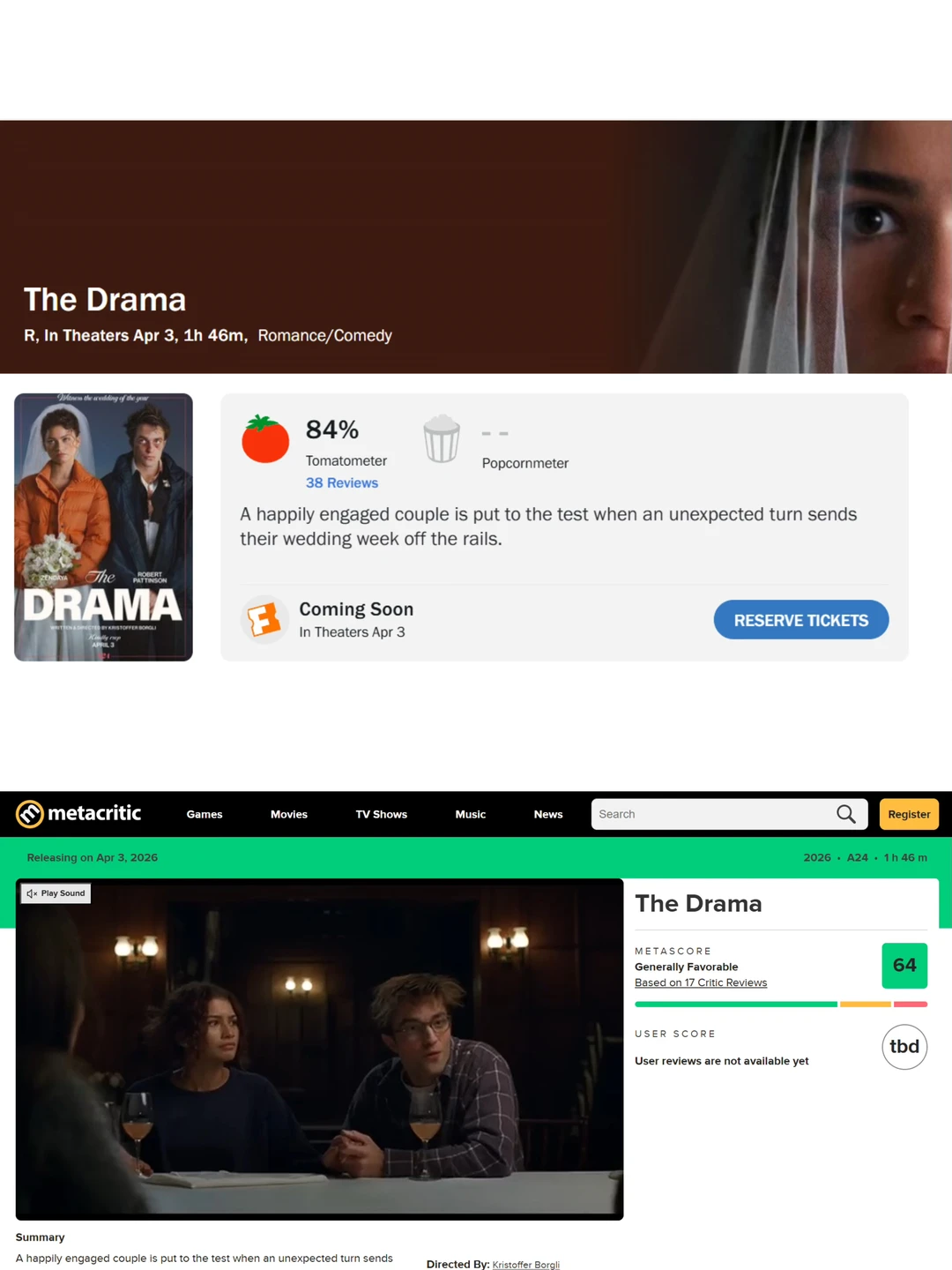 🔥 A24年度瞩目爱情片《爱情抓马》媒体口碑出炉,烂番茄新鲜度84%,MTC评分64分,在爱情片类型中表现尚可。