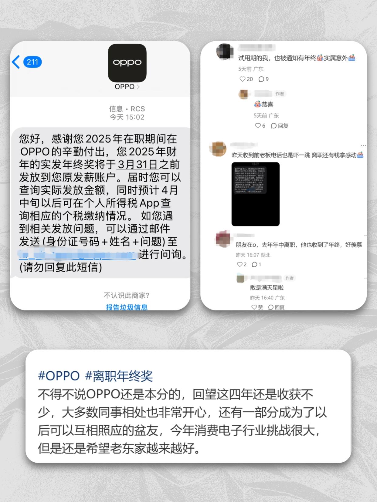 又是实名羡慕的一天!OPPO待遇这么好吗? 最近刷到OPPO离职员工晒年终奖的帖子,我直接破防了!!怎么离职了还有年终奖、补偿的的!! 主要是还刷到好多,都在晒到账记录,离职大半年了照样能领到足额年终奖,还有N个月工资的离职补偿!不是个别案例,是坚持多年的惯例,OPPO这格局真的绝了! 之前都说手机圈里,OPPO是出了名的本分,感觉真不是嘴上说说,是实实在在做到了。做正确的事,不赚人便宜,就算员工走了也要兑现承诺。对比那些想方设法克扣离职员工的公司,OPPO这波真的太圈粉了,打工人看到都想哭😭 我自己用OPPO也好几年了,售后服务真的没话说!随便找一家门店就能免费贴膜、清洁手机,手机有啥问题也都会尽心尽力解决,真没毛病! 对员工本分,对用户用心,这样的企业活该长久啊!希望所有大厂都按这个标准卷起来好吗! 年终奖 打工人日常 OPPO OPPO手机 离职 离职补偿 本分大厂 数码科技 离职补偿金