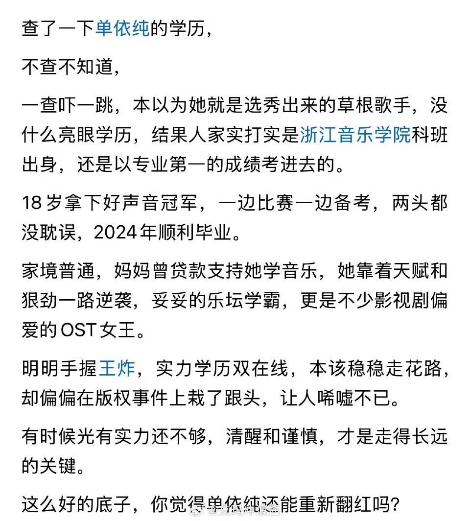查了一下单依纯的学历, 不查不知道,一查吓一跳