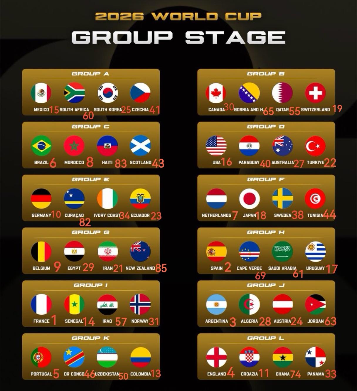 随着世界杯附加赛的结束,26年世界杯最终参赛球队全部确认,根据最新的世界排名(图中红色数字)再看分组情况,我们对死亡之组可能又会有新的看法! 如果从看点和名气上来看,法国队所在的I组应该算是死亡之组,这组除了有世界第一法国外,还有非洲一哥塞内加尔,哈兰德领衔的挪威,以及最后一个进入世界杯正赛的伊拉克!姆巴佩VS哈兰德,殖民地VS宗主国,经过战争洗礼的伊拉克重回世界杯,都是看点! 但要从球队实力和竞争激烈程度来看,D组才是真正的死亡之组,美国、巴拉圭、澳大利亚和土耳其这四支球队谁也不敢说谁有优势,谁也不是软柿子,最后谁能出线真的很难预测!正如他们的世界排名一样,互相之间非常接近,没有明显差距! 世界杯扩军后,小组第三也有很大概率出线,所以跟往届相比,强队在小组赛翻车的概率极低!同时,由于扩军后个别实力较弱的球队进入了世界杯正赛,小组赛阶段更容易出现大比分了,尤其海地、库拉索和新西兰所在的小组,强队们肯定不会错过这个刷进球的好机会,而巧合的是这三个小组的种子队巴西、德国和比利时在踢弱队时,一向都是不留情面的!球迷们这回有福了!