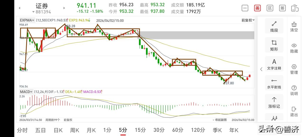 证券板块晚评(2026.4.2) 今天下午,证券板块还是没有反弹,但是没有关系,它并没有破坏底部中枢结构,只能说回踩的比较强劲,这里就是一个震仓,还是因为之前没有恐慌盘出来的缘故,尽管今天破了新低,但破与不破,此处是没有意义的。 1.从30分钟图一上看,还是围绕中枢做上下震荡,而且超过了9笔,已升级成为一个日线中枢结构,这样的话,它在日线上也走了三个完整的日线中枢结构,那么整个周线中枢的离开段就结束了,后面只有反弹加反转,所以此处无需担忧,仍可考虑持股待涨。 2.从5分钟图二上看,今天全天的回踩比较强劲,走了三个5分钟中枢,那么,这笔调整也就结束了,明天继续看反弹加反转,此处是机会远大于风险的,无忧! 总之,上方缺口迟早会拿下,先看100点的反弹依旧可期。券商策略解读 股票交易