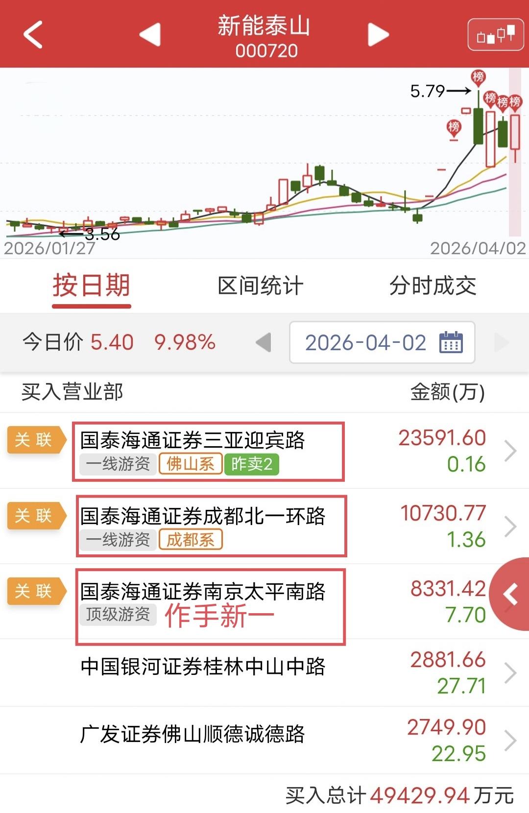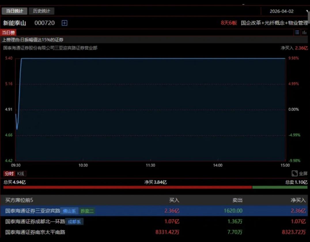 佛山系合买4.1亿封板 今天还在逆势做多的游资太少了,不过在新能泰山上倒是看到几个熟悉的身影。 今天新能泰山快速涨停。盘后龙虎榜显示,佛山系买入2.3亿,成都系买入1亿,作手新一买入8300万,合计4.13亿。 佛山系昨天亏了,今天又干进去,猛啊。 不过这只票挺有意思,这周是一天涨停一天跌停,上蹿下跳的。