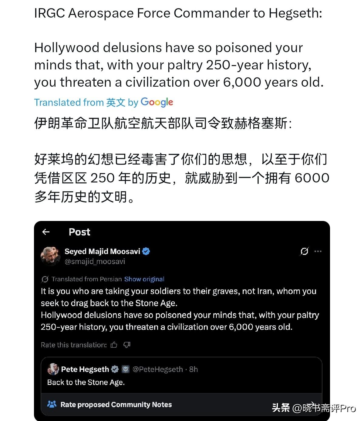 赫格塞斯被伊朗公开点名!伊朗的意思是,做人别太狂!4月2日,根据外媒报道,伊朗伊斯兰革命卫队空天部队司令点名赫格塞思称: 好莱坞式的妄想已经彻底毒害了你们的思想。你们区区两百五十年的历史,竟敢威胁一个拥有六千多年文明的古国。 为什么此时伊朗专门点名赫格塞斯?毫无疑问,这是因为在伊朗看来,美国的这个战争部长太狂了,从战争开打至今,赫格塞斯放的狠话最多,且立场最为强硬。当然,战争持续至今,应该说伊朗完全有资格对美国说这一番话。美国纸面实力确实比伊朗强太多了,但是伊朗硬是缠住了美国,让美国感到极为头疼。 从战术层面,伊朗确实给美国好好的上了一课。一开始,伊朗就用廉价的无人机消耗美以防空弹药。其后,伊朗又专打美国的雷达,破坏美国的战场态势感知能力。借着,伊朗又打击美军在中东基地,让美国的盟友们不敢下场帮美国。在接着,伊朗封锁霍尔木兹海峡,让美国对油价飙涨感到肉疼。 当然,这还不算完,为了给美国立规矩,伊朗宣布美国打击伊朗境内何种目标,伊朗就反击打击盟友的对应境内目标。结果海湾国家的铝企,淡水处理厂等都成为被打击目标,这让美国投鼠忌器。现在伊朗在给美国立规矩,如果美国攻击伊朗石油设施,刺杀伊朗高层领导人,伊朗将打击美国的企业。很显然,伊朗从战术层面可以说让美国非常的头疼。就战场上表现的智慧,伊朗无疑很好的回敬了美国的狂妄。