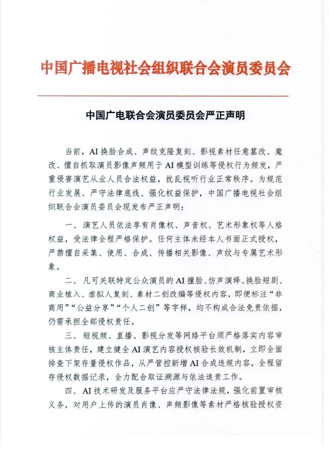 严禁未经授权合成演员形象当前,AI换脸合成、声纹克隆复刻、影视素材任意篡改、魔改、擅自抓取演员影像声频用于AI 模型训练等侵权行为频发,严重害演艺从业人员合法权益,扰乱视听行业正常秩序。为规范行业发展、严守法律底线、强化权益保护,中国广播电视社会组织联合会演员委员会现发布严正声明:一、演艺人员依法享有肖像权、声音权、艺术形象权等人格权益,受法律全程严格保护。任何主体未经本人书面正式授权,严禁擅自采集、使用、合成、传播相关影像、声纹与专属艺术形象。二、凡可关联特定公众演员的AI 撞脸、仿声演绎、换脸短剧、商业植入、虚拟人复刻、素材二创改编等侵权内容,即便标注“非商用”“公益分享”“个人二创”等字样,均不构成合法免责依据,仍需承担全部侵权责任。三、短视频、直播、影视分发等网络平台须严格落实内容审核主体责任,建立健全 AI 演艺内容授权核验长效机制,立即全面排查下架存量侵权作品,从严管控新增AI 合成违规内容,全程留存侵权数据记录,全力配合取证溯源与依法追责工作。四、AI 技术研发及服务平台应严守法律法规,强化前置审核义务,对用户上传的演员肖像、声频影像等素材严格核验授权资务,切实履行合规管控责任。五、本会启动全网常态化侵权监测、公证固证及批量维权行动,支持演员依法维护自身权益,对恶意侵权个人、机构,及未尽审核义务的平台,依法追究民事、行政乃至刑事责任。六、支持 AI技术合规赋能影视文艺创新发展,倡导行业建立统一透明、权责清晰的肖像、声纹、艺术形象授权标准与收益分配机制,共建守法合规、健康清朗的网络视听生态。