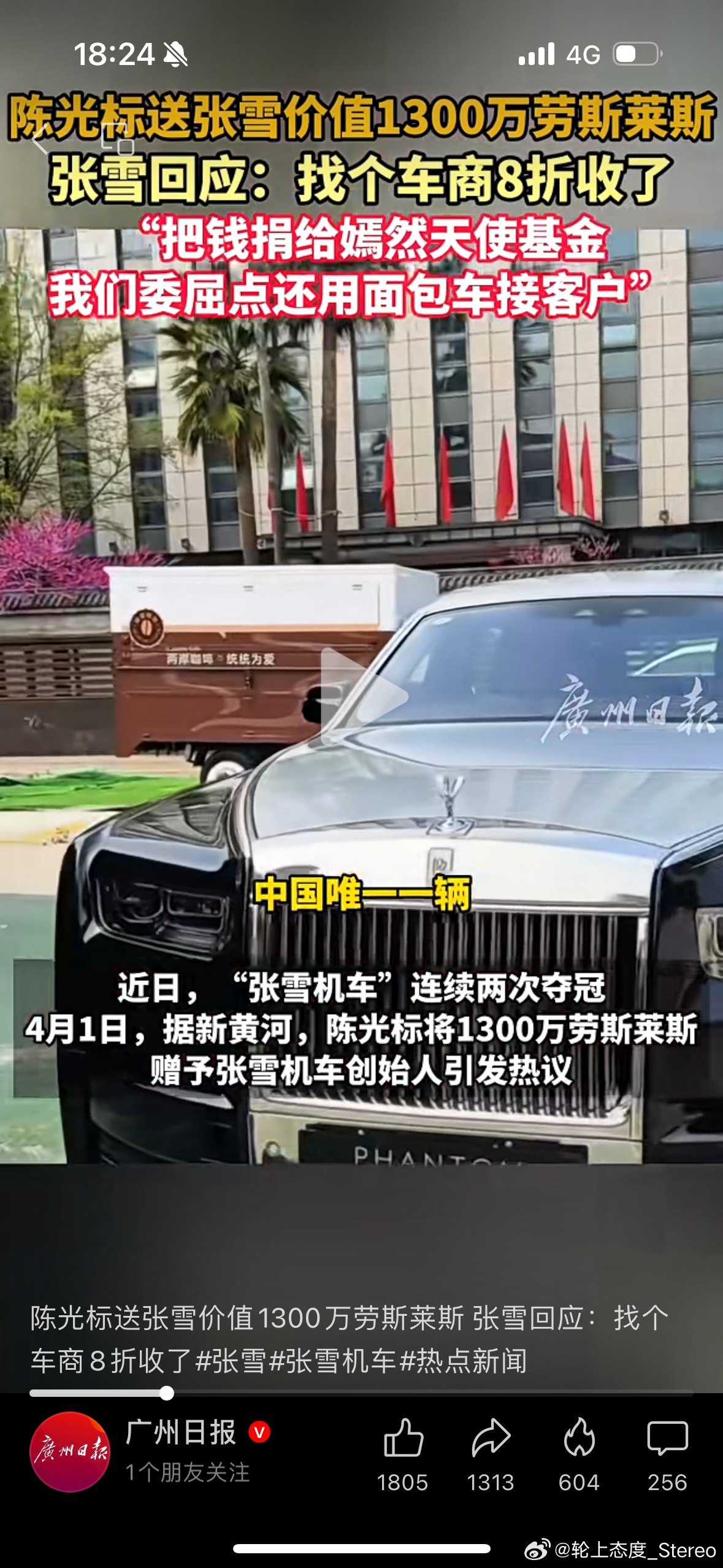 陈光标称将送张雪1300万劳斯莱斯足够坦诚和率真会让人在社交中有更少的弱点张雪:玩的就是真实,你看我真不真实你就完了两个人走的就不是一个道,这样对大家都好不是吗