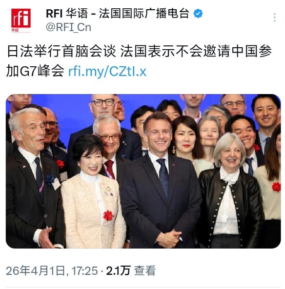 这下中国被 “孤立” 了 马克龙前脚刚踏到日本土地,后脚就把今年 6 月依云 G7 峰会的邀请名单定死了 —— 中国不在受邀之列。法广 4 月 1 日报道的这个消息,看似只是会议名单的调整,实际上把法国自己搁进了一个挺尴尬的位置:日本怕中国来,法国就真的不让来了。 这事得往前捋。法国之前是有自己算盘的。2026 年 1 月 1 日,法国正式接任 G7 轮值主席国,峰会定在 6 月 15 日到 17 日,地点选在法国东部的依云莱班。 作为东道主,马克龙一开始打的主意是拉中国进来,一方面想借中国的经济体量给 G7 撑撑门面,改变这个西方小圈子的形象,另一方面也是想展示欧洲的战略自主,不想什么事都听美国的。马克龙甚至公开说过,G7 不能变成反华俱乐部。 可这个算盘刚打出来,日本就第一个跳出来反对。日本作为 G7 里唯一的亚洲成员国,一直想在这个平台上掌握亚洲话语权,怕中国参会后自己的地位被削弱,没法再像以前那样大谈中国威胁论。 日本通过各种渠道向法国施压,甚至放话,如果中国参会,日本可能拒绝签署峰会的联合声明。 面对日本的阻力,法国其实也没放弃。2026 年 1 月 8 日,马克龙在法国驻外使节年度会议上,还再次表态,坚持希望邀请中国参会。 他在中间左右为难,既想和中国搞好关系,获取经济和外交利益,又不想彻底得罪美国和日本这些核心盟友,只能小心翼翼地找平衡。 到了 2026 年 3 月下旬,事情有了结果。3 月 26 日,法国政府正式公布了 G7 峰会的嘉宾国名单,印度、韩国、巴西、肯尼亚都在上面,唯独没有中国。几乎是同时,法国官员在媒体吹风会上向路透社确认,中国已正式通报不会出席这次峰会。 本来事情到这里就算告一段落了,可法国官员接下来的一番话,彻底把局面搞僵了。 他不仅承认中国不来,还抛出一句火药味十足的话,说北京最大的风险,就是看到全球市场,尤其是欧洲市场,对其关闭大门。 这些年,G7 在对华议题上越来越政治化,已经成了一个预设好围攻剧本的外交秀。 2025 年 11 月的 G7 外长会议,就给中国提了三个 “不许”,包括不允许中国援助俄罗斯、不允许改变台海现状、不允许限制稀土出口。到了 2026 年 3 月的 G7 声明,更是直接删除了 “一个中国” 原则的表述,在台海问题上升级了措辞。在这样的背景下,中国怎么可能去参加这样的会议? 中国外交部早就说得很清楚,对话的前提是相互尊重和平等。你既然不尊重我的核心利益,把会场布置成审判庭,让我去当被告,那我自然不会去凑这个热闹。中国拒绝的是这种充满对抗性的多边场合,不是拒绝和世界对话。 法国官员的这番威胁,更像是一种政治秀,而不是可落地的政策。中欧之间的经贸联系非常紧密,欧洲的很多企业,像空客、雷诺、欧莱雅这些,都在中国市场有巨大利益。 如果真像法国官员说的那样,关闭欧洲市场,那法国自己的企业也会遭受巨大损失。 就在法国官员放话威胁的时候,马克龙正在日本访问。4 月 1 日,他和日本首相高市早苗举行了正式会晤。这次会晤的核心议题,除了中东危机带来的能源安全问题,还有稀土和太空合作。 双方在联合声明里明确提到,要加强出口管制等经济胁迫的关切,这句话指向谁,大家都心里清楚。马克龙还在讲话中说,要避免过度依赖任何一个霸权国家,这里面既提到了美国,也提到了中国。 马克龙这次访日,其实也是在为 G7 峰会铺路。他想联合日本,甚至印度,在 4 月底的 G7 峰会前,就霍尔木兹海峡的合作机制达成共识,形成一个法日印的铁三角,共同推动地区局势降温。同时,他也想通过稀土和太空合作,拉拢日本,巩固自己在 G7 内部的影响力。 可法国现在的处境确实很尴尬。日本怕中国来,法国就真的不让来了,这让法国看起来像是在完全迎合日本的意愿,失去了自己的外交独立性。 而中国拒绝参会,又让法国精心策划的邀请计划落空,东道主的面子上挂不住。更麻烦的是,法国官员的威胁言论,反而让中国更加坚定了不参会的决心,也让其他国家看清楚了法国的尴尬处境。 所以,所谓的 “中国被孤立”,其实根本不成立。中国一直坚持开放合作,积极参与全球治理,通过共建 “一带一路”、推动金砖国家合作、深化与东盟的关系,不断扩大自己的朋友圈。相反,G7 这种排他性的小圈子,才越来越不符合时代的潮流。 马克龙前脚刚到日本,后脚就定死了不邀请中国的 G7 名单,这背后是法国的无奈和尴尬。日本的压力、内部的利益博弈、自身的战略考量,都让法国不得不做出这样的选择。 但这个选择,不仅让法国自己陷入了被动,也让 G7 的未来更加不明朗。而中国,始终坚持自己的原则和立场,不会被这种充满对抗性的小圈子所左右。