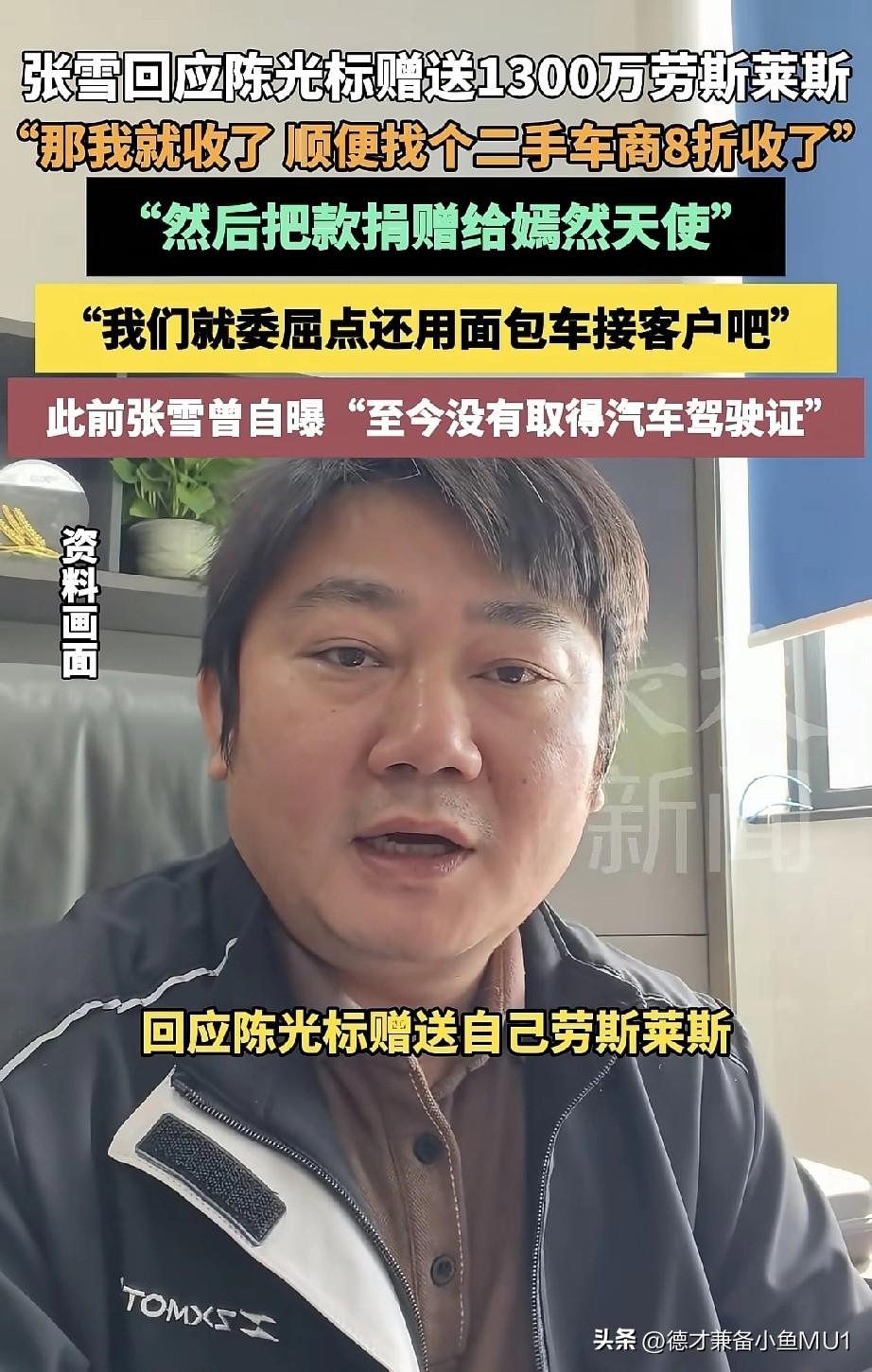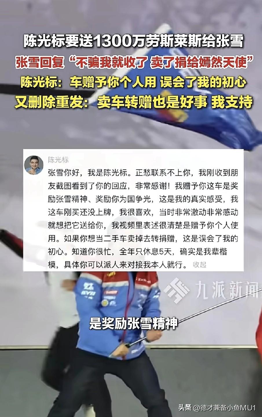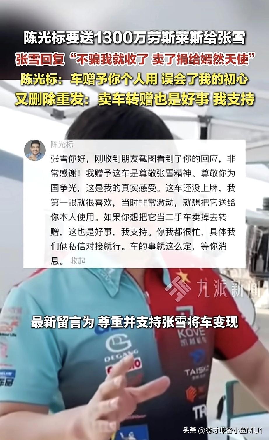 陈光标宣称要送价值1300万的劳斯莱斯幻影给张雪,张雪回复:“你不骗我,我就收下,然后找个二手车商卖了,捐给嫣然天使。” 随后,陈光标回应:“刚在朋友截图看到你的回复,非常感谢。我赠与你这车,是为了表彰张雪精神,奖励你为国争光,这是我由衷的想法。这车我刚买到手,还没上牌,我很喜欢,当时激动又感动,就想把它送给你。我在视频里说得很清楚,是赠予你个人使用。如果你想把它当二手车卖掉转赠,那是误会了我的本意。你很忙,全年只休五天假。这事你可以派人过来和我本人对接就行。” 不过,这条回应没过多久,疑似本人就将其删除了。 接着,陈光标又作出回应,称尊重张雪将车变现用于慈善的决定,这是好事,还喊话私信对接。 感觉陈光标此时有些骑虎难下。他像是想空手套名声,料定张雪会婉拒,所以才提出送车,没想到张雪真要,只能赠送。张雪是实干派,不像陈光标擅长炒作。这车还没到手就要八折处理,要是炒作一番,折扣岂不是更大!气运加身的名人一手车,意义非凡。 我对张雪回应的理解是:谢谢标哥的好意,您送车给我让我很惶恐,不如直接折现捐给嫣然基金。 张雪不会要这车,但做慈善的心是真诚的。如果送车再变现,还不如直接让标哥捐款,因为捐款不是为了名利,而是真心希望有善款流入社会,标哥捐和张雪捐其实没区别。 这有点像楚云飞遇上李云龙,对方不按套路出牌;仔细想想,楚云飞是光明磊落之人,这更像是谢宝庆遇到了李云龙。 对此,大家怎么看?