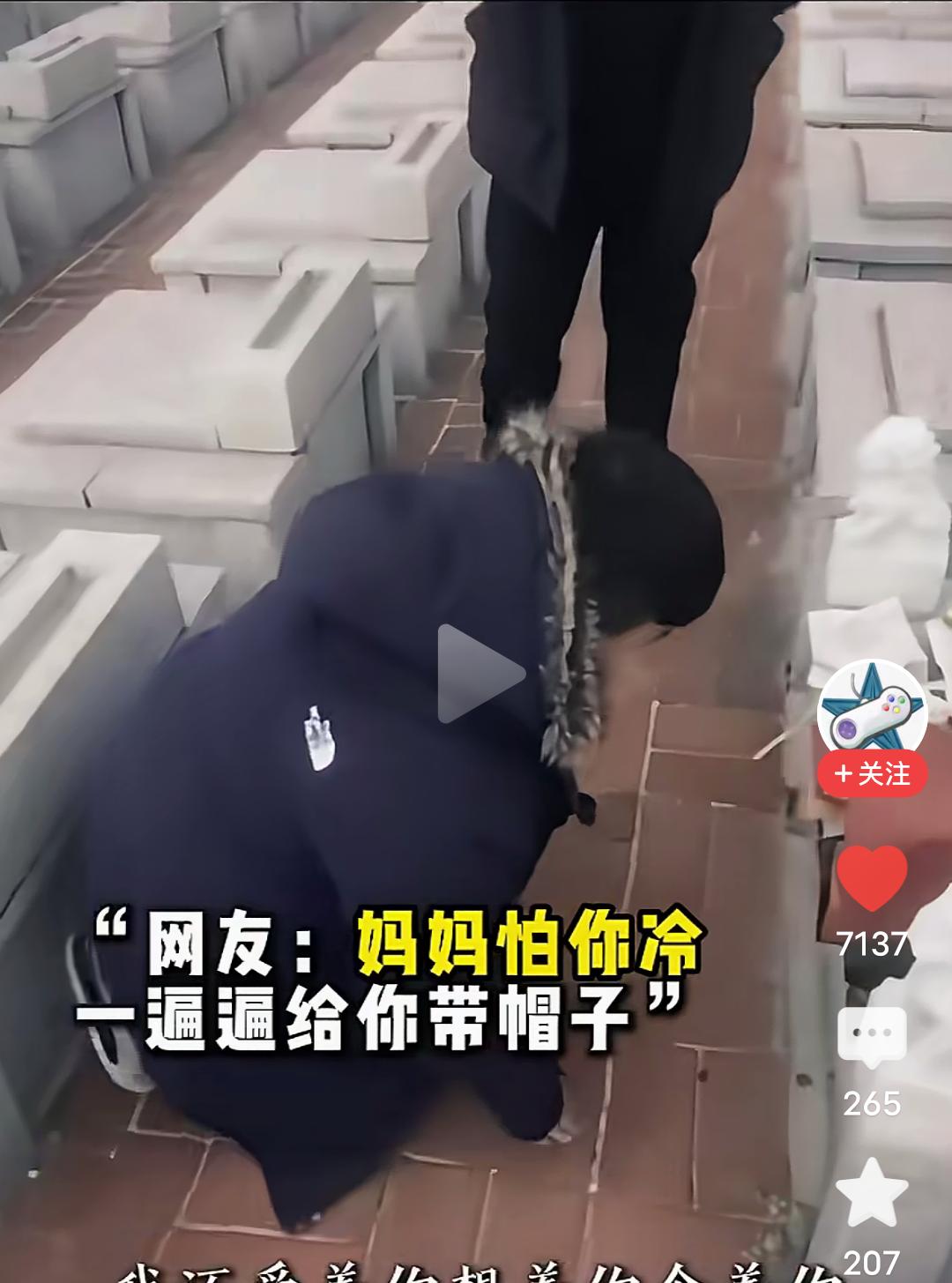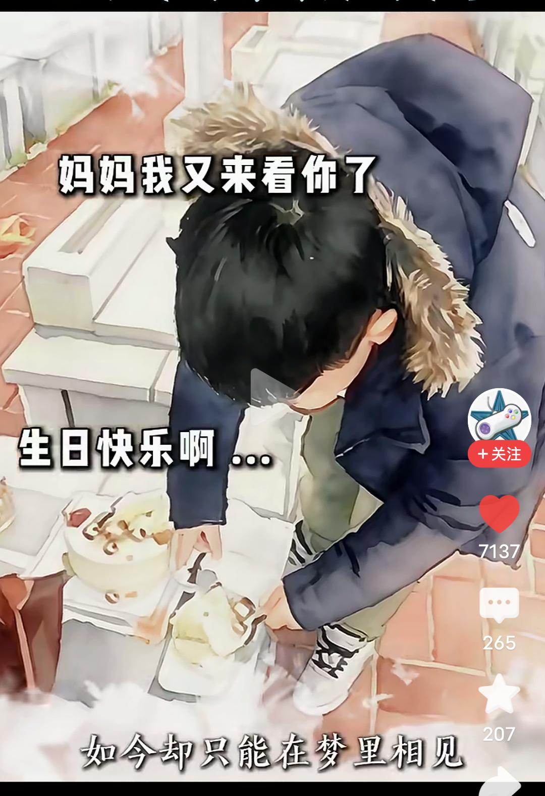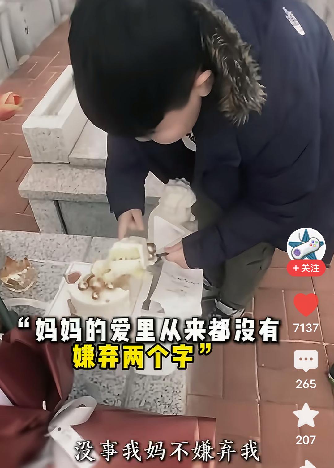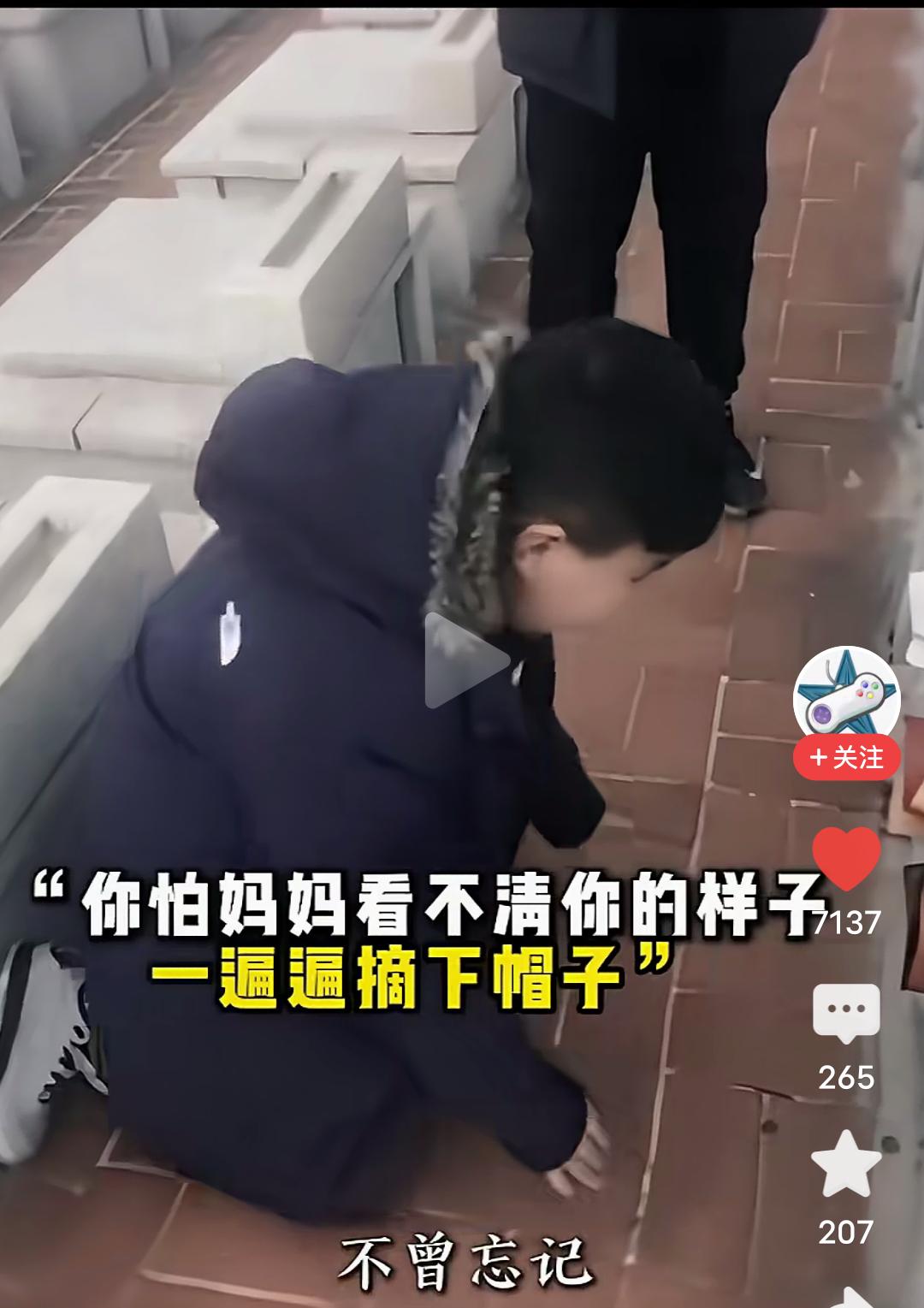妈妈的爱里,从没有嫌弃两个字! 刷到一个视频,男孩和爸爸去墓地给去世的妈妈过生日,切蛋糕时,蛋糕太紧,不好切,爸爸就让他用两只手,男孩就直接用手拿蛋糕给妈妈递过去,爸爸说你洗没洗手啊,男孩的一句话让人落泪,他说“没事,我妈妈不嫌弃我”! 是啊,在妈妈的爱里,从来没有嫌弃二字,可如今却只能在梦里相见了。 男孩摘下帽子给妈妈磕头,一磕头帽子就自动戴上了,男孩再摘帽子,再磕头,帽子再次戴上…… 网友的话让人泪崩:那是妈妈怕你冷,一遍遍的给你戴上,而你又怕妈妈看不清你的模样,一遍遍的摘下…… 看到这里我早已经泪流满面,这一切都是天意吧。 活着的人想念远去的妈妈,远去的妈妈放不下活着的人,这大概就是母子情深吧! 寒日寄母恩,一步一叩身;阴阳两不见,唯有爱恒真!