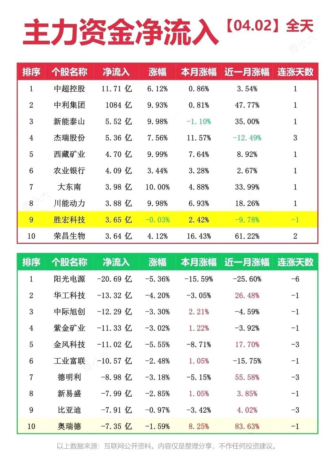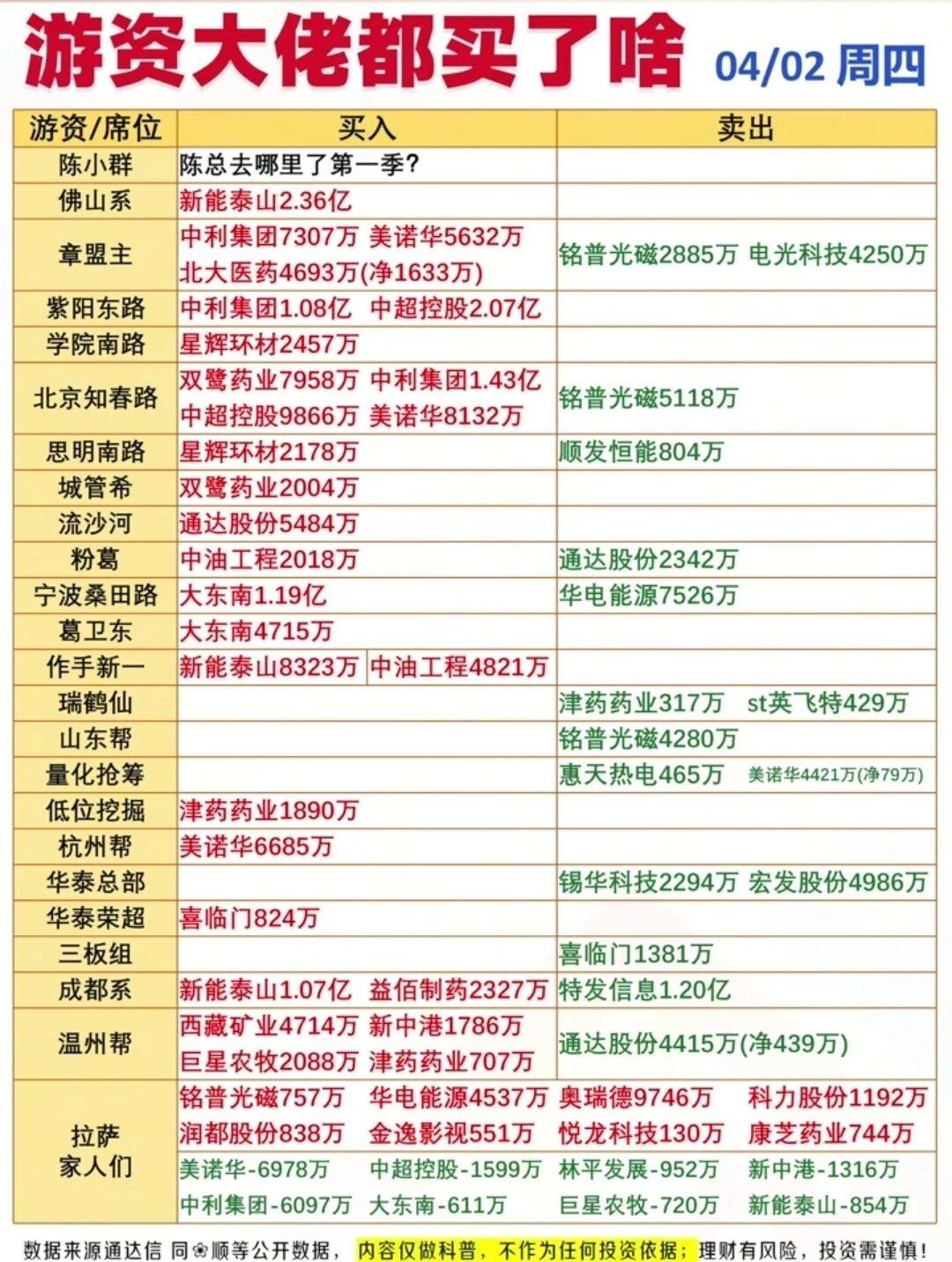 04.02盘面复盘:资金调仓换股,主线轮动加速! 板块与个股端尽显博弈热度:主力资金流向呈现明显分化,油服工程、银行、化学制药等板块获资金净流入,半导体、光伏设备、IT服务等板块则遭资金大幅净流出;个股层面,中超控股、中利集团、新能泰山等成为主力资金追捧焦点,阳光电源、华工科技等则面临资金撤离。 游资动向同样暗藏玄机,陈小群、章盟主、作手新一等知名游资席位现身龙虎榜,新能泰山、中利集团、大东南等核心标的成为游资博弈主战场。连板梯队中,津药药业晋级5板,通达股份、星辉环材等拿下3板,医药生物、电力设备、电子等板块成为连板核心阵地,连板个股的表现也勾勒出当前市场的核心情绪主线。 在市场缩量调整、板块轮动加速的背景下,资金围绕主线反复博弈,后续需关注主力资金流向与游资情绪变化,把握市场轮动节奏。 理财有风险入市需谨慎!资料全网公开,仅供参考不能作为投资依据