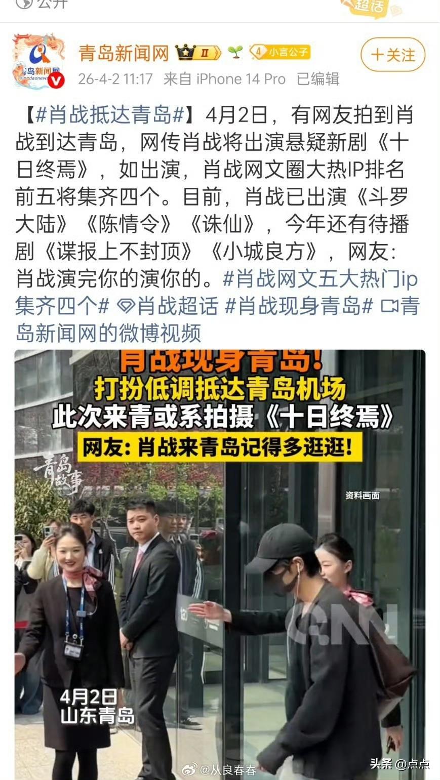 肖战现身青岛 疑进组拍摄悬疑新剧《十日终焉》 4月2日,青岛新闻网记者在机场偶遇艺人肖战,他身着一袭黑衣低调抵达青岛,引发网友广泛关注。据网传消息,肖战此次前往青岛,是为了进驻青岛东方影都,拍摄悬疑题材新剧《十日终焉》。 值得关注的是,网文圈大热IP排名前五的作品中,若肖战成功出演《十日终焉》,将集齐其中四大热门IP,这一消息也让不少网友和粉丝倍感期待。据悉,这已经是肖战第三次来到青岛开展工作,此前他也曾在当地参与影视相关拍摄工作,与青岛颇有渊源。 肖战现身青岛的消息曝光后,粉丝们纷纷留言互动,不少人表示五一假期将要前往青岛,打卡肖战工作地,掀起一波打卡热潮。 肖战现身青岛 肖战网文五大热门ip集齐四个