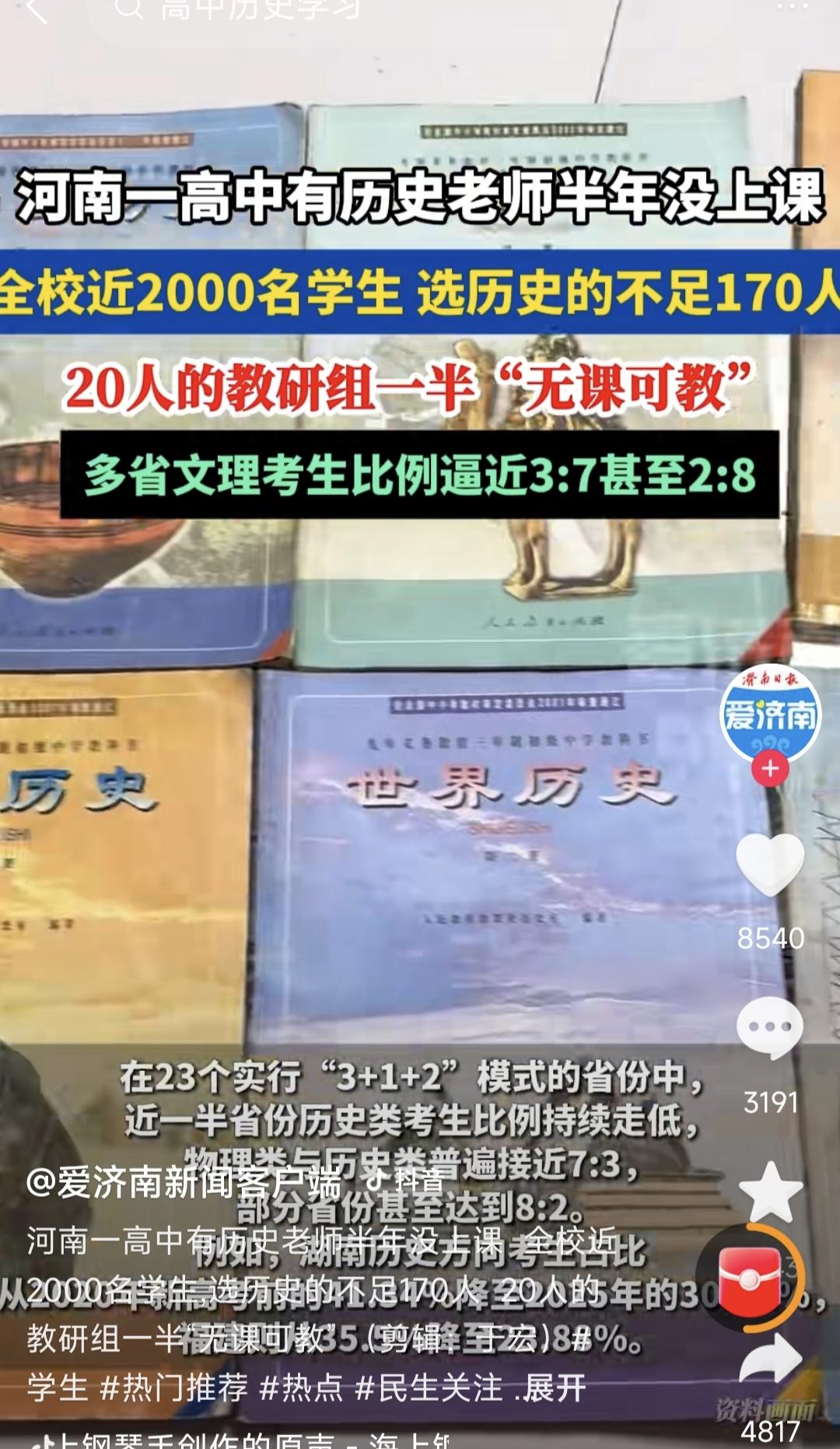高中历史老师无书可教,半年没课上,令人不胜唏嘘,却又都在预料之中。河南一高中历史教研组有20人,但一半的老师无课可上,引起网友的广泛关注。根源在于高中学生选科重理轻文,越是重点高中,理科生的比重越重,文理科生的比例达到了惊人的2:8,而这又源自于文科生求职艰难,可提供的工作机会少。想起文科生的就业,可能大部分人都会想到考公,但考公又是何其的艰难,让不少想读文科生的孩子望而却步。 几十年变化真的很大,九几年我们学校的历史系毕业生还很抢手,我的印象挺深的。那一年毕业的时候,北京,上海,广州,深圳,成都,重庆等大城市都需要很多历史老师,纷纷去我们学校历史系招老师,所以那一届历史系毕业生大都去了大城市,还有一部分毕业分配直接去了机关,基本不用愁就业,全员都找到了工作。 现在男生基本上没有什么选文科的,这也是值得关注的一个趋势,抛却文科,我们会失去什么,很多专家学者开始讨论,大家的看法是什么呢?教育 大学