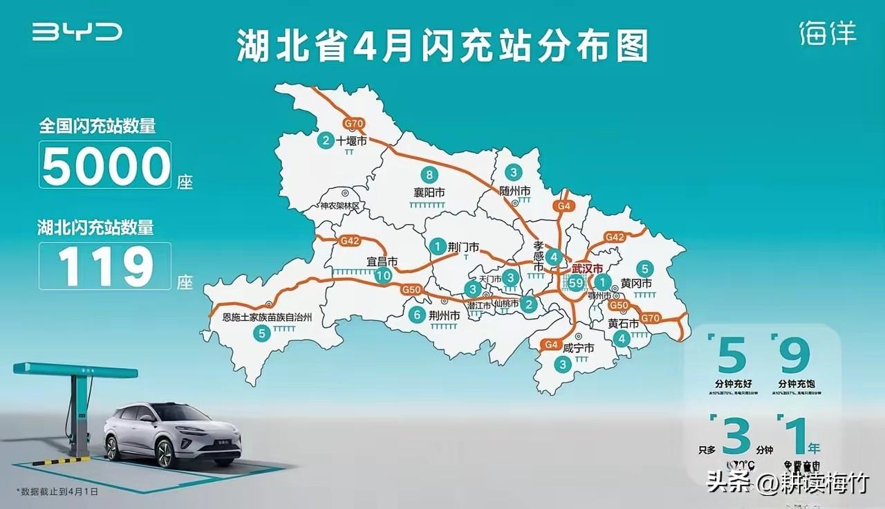 比亚迪闪充桩湖北省119个武汉占59个! 比亚迪闪充桩扩张速度还是挺快的,目前全国已经有5000座了,咱大湖北也有119座了,不过有一半是在武汉! 也许这就是大城市的优势吧,什么资源都会受到倾斜,剩余其它城市除了宜昌有10座,其它的都是个位数,连襄阳也是! 不知道这数量分配是按什么确定的,是凭感觉来的还是依据新能源汽车的拥有量定的? 你们家附近发现有闪充桩了吗?