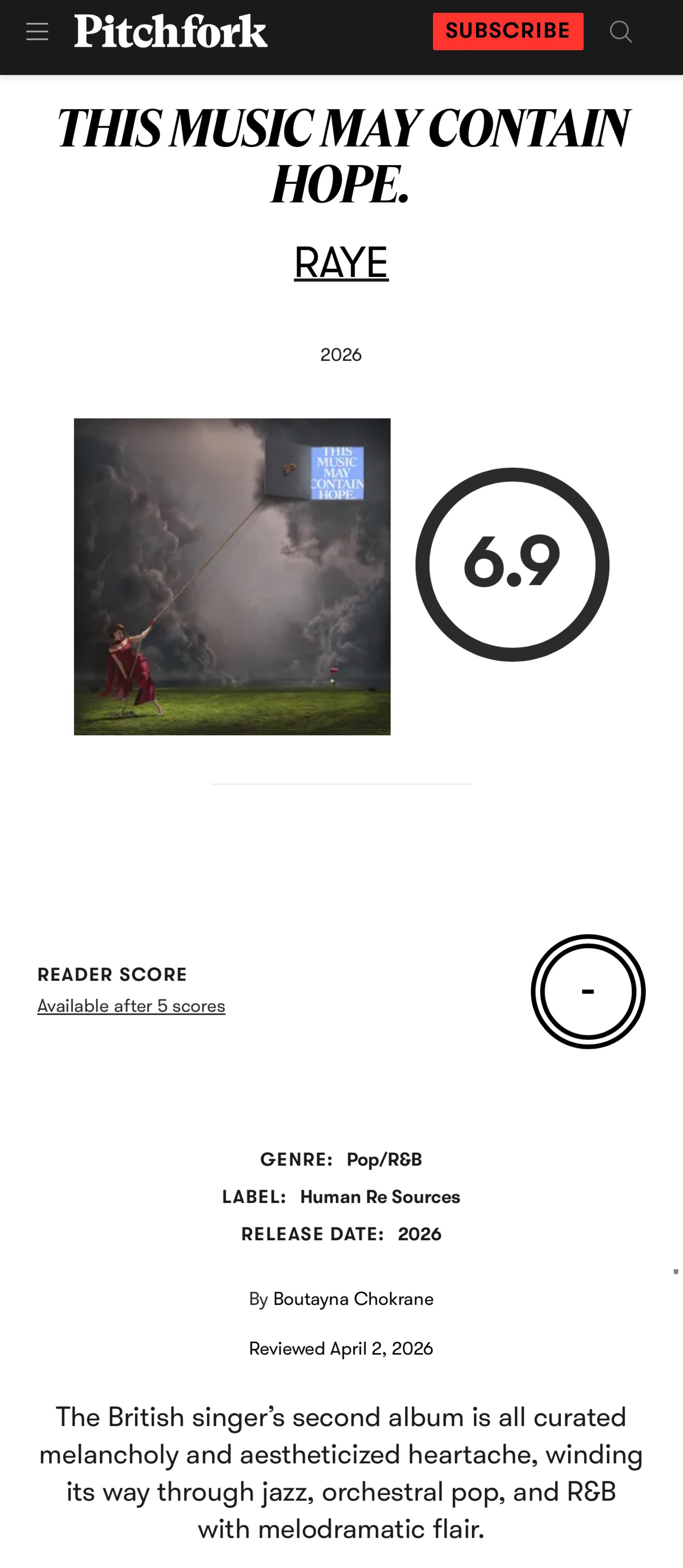 婊叉Pitchfork终于给RAYE新专辑《THIS MUSIC MAY CONTAIN HOPE.》打分了——只有6.9分!和碧梨Billie Eilish神专《HIT ME HARD AND SOFT》的6.8一个分数级别,并刚刚高于检验线小猪佩奇首专的6.5!四字点评!