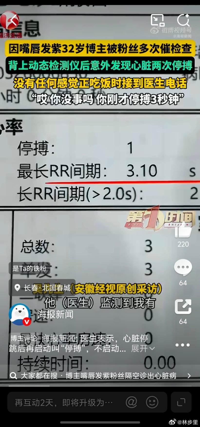 博主嘴唇发紫被提醒后确诊心脏停搏张雪峰那时候如果听取网友的建议,及时去检查,是不是也能捡回一条命?