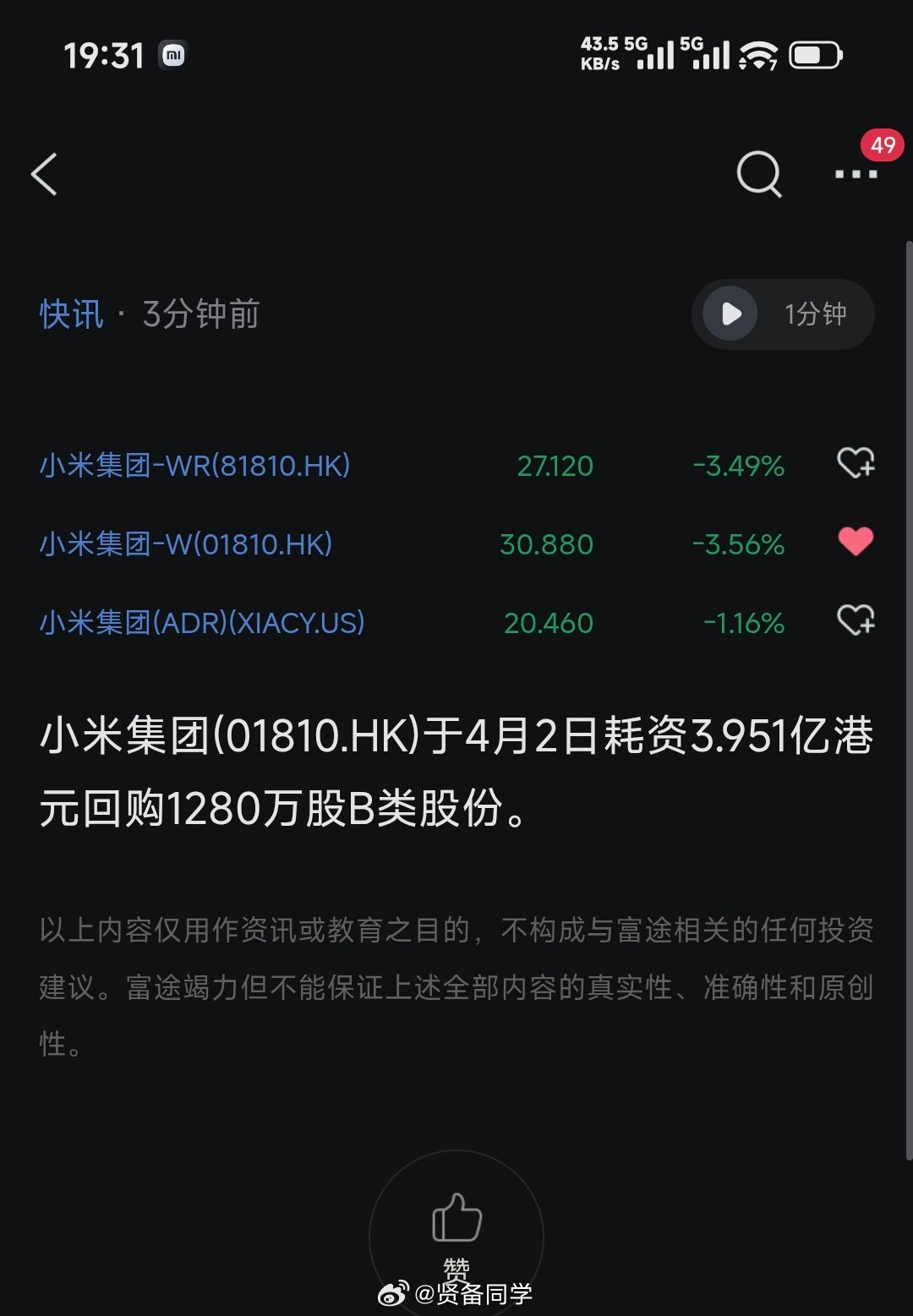小米今天回购金额创新高,接近 4 个亿的港币!态度是可以的!特斯拉小米