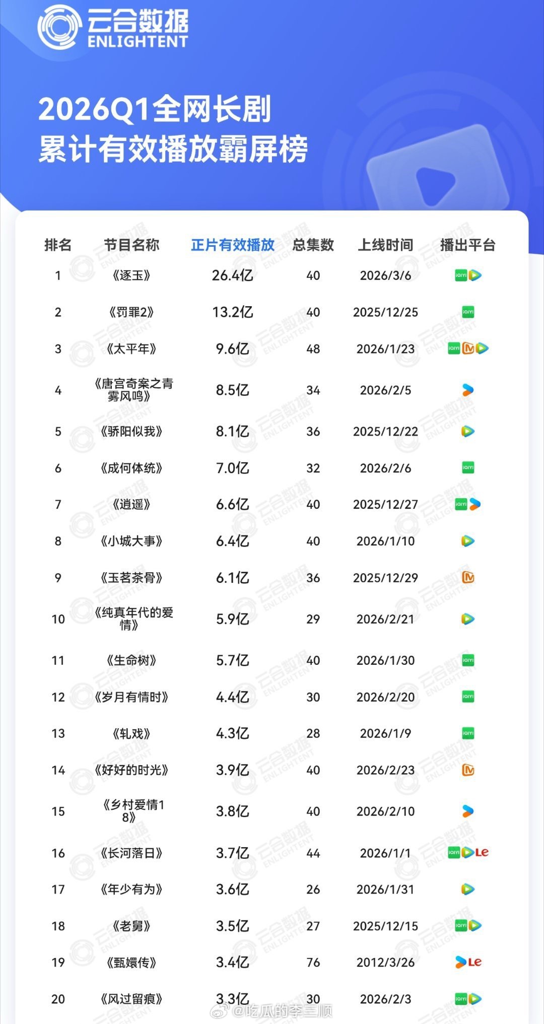 2026年Q1长剧云合累计有效播放霸屏榜🈶逐玉 罚罪2 太平年