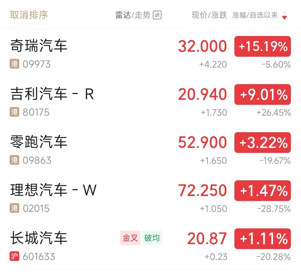 吉利汽车和奇瑞汽车港股股价涨疯了,截至2日收盘,奇瑞汽车上涨4.24港元,涨幅15.19%,市值1866亿港元(1638亿元人民币);吉利汽车上涨1.84港元,涨幅8.37%,市值2572亿港元(2265亿元人民币); 作为对比,A股上市的几家公司是这样的: ●上汽集团股价下跌3.44%,市值1645亿元; ●赛力斯股价下跌2.92%,市值1552亿元; ●长城汽车股价上涨1.11%,市值1786亿元。 这就意味着,吉利汽车市值已经超过其它所有车企,仅次于比亚迪(9268亿元)。 奇瑞汽车市值也超过了赛力斯,比上汽集团只少7亿元,可以说无限接近了。 奇瑞汽车和吉利汽车股价为何大涨?兴许和一季度的销量有关。吉利汽车一季度销量70.9万辆,奇瑞汽车一季度销量60.9万辆,重点是它们的海外市场销量都很给力,奇瑞汽车累计出口39.44万辆(+53.9%),吉利汽车累计出口20.30万辆(+126%)。 但是,3月份销量突出的上汽集团(37.58万辆)、长安汽车(27万辆),股价都是下降的,真是岂有此理?!祝贺奇瑞汽车和吉利汽车的股东,你们发财了!吉利汽车 奇瑞汽车