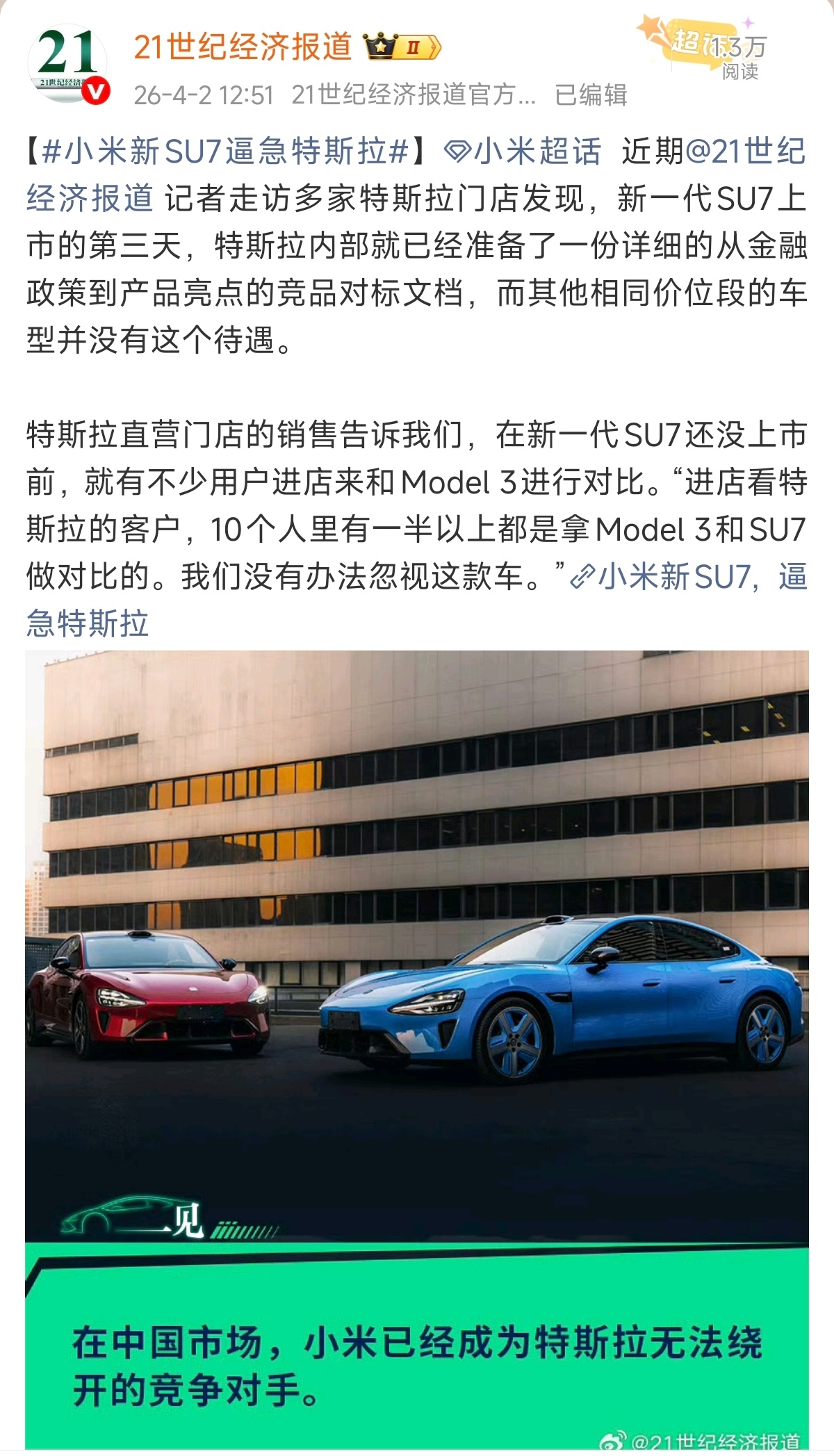 小米新SU7逼急特斯拉喊了整整五年“中国新能源围剿特斯拉”,喊过降价战、喊过换电、喊过智能驾驶,最后真正把特斯拉逼到墙角、让它拿出最高规格应对的,是小米单枪匹马杀进了它最核心的纯电轿车腹地。媒体的报道印证了行业共识:新一代SU7上市第三天,特斯拉内部就紧急出台了全维度专属竞品对标文档,从金融政策到产品亮点逐条拆解,而同价位其他车型从未有过这个待遇。一线门店的反馈更直白:进店看Model 3的客户,10个里有一半以上都在拿SU7做对比,销售坦言“我们没有办法忽视这款车”。这种焦虑不是空穴来风。2025年小米SU7全年交付超24万台,直接超越Model 3拿下20万元以上纯电轿车销量冠军;截至2026年2月,SU7累计交付39.9万辆,已经反超同期Model 3的39.17万辆。YU7的表现同样亮眼,单月交付量多次超越Model Y。我身边特斯拉车主很多,小米车主也很多,两边的评价其实高度趋同:两车的操控和能耗都属第一梯队,但SU7在车机本地化、功能丰富度和内饰质感上的领先是全方位的。新一代SU7又在安全、智能驾驶和操控上做了全面升级,进一步拉大了体验差距。