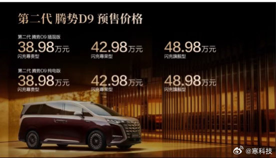 3月29日,备受关注的科技豪华旗舰MPV--第二代腾势 D9开启预售,集比亚迪第二代刀片电池、天神之眼5.0等前瞻科技于一身,在电动、智能、豪华设计等方面全维进化,重塑豪华MPV价值新标杆,堪称时代旗舰,大成之作!第二代腾势D9预售价格区间为38.98万-48.98万。即日起下订,在1年免费闪充的基础上,再额外赠送6个月的免费闪充权益,总共18个月的免费闪充权益,让每一次出发都更从容第二代腾势 D9搭载比亚迪第二代刀片电池,续航全面突破:插混车型纯电续航达401km,远超同级,无论是日常代步,还是短途商务,皆可全程纯电,无需费油;纯电车型续航高达800km,跨城商务会议、全家出游不焦虑。同时,新车还实现了"5分钟充好,9分钟充饱,零下30°C只多3分钟”的颠覆性闪充体验,买杯咖啡的时间即可满电,搭配遍布全国的闪充站,让长途出行告别里程焦虑。第二代腾势D9的长续航+闪充,才是新能源豪华MPV的黄金组合,实现充电自由+时间自由+出行自由,让用户真正零焦虑.即日起下订,即可解锁专属尊崇权益,抢先与第二代腾势D9共赴时代巅峰,共同见证中国豪华迈向世界新高度!