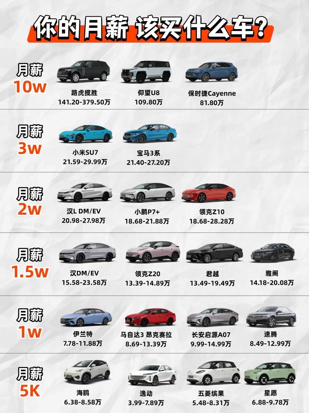 打工人购车段位图鉴,月薪对应车型直接抄作业 新车轮番上新看得心痒痒?买车切记量力而行,别为了面子给自己添负担~ 超直白的薪资选车指南来了,不同收入对应适配车型,一看就懂! 月薪5k|高性价比代步小车 主打实用省心就对了! 海鸥、五菱缤果这类纯电微型车,用车成本低、车身小巧超好停车,月供千元以内,完全没经济压力 月薪1w|人生首台家用主力车 终于能入手靠谱家轿了!伊兰特、速腾这类经典紧凑型轿车,月供2k上下,养车轻松无压力,日常通勤、周末出游都体面 月薪1.5w|轻奢家用B级车档 质感生活直接拉满!汉DM、雅阁这个级别的车型,空间宽敞配置能打,带家人出行也不局促,月供3k多在合理承受范围 月薪2w|智能小资座驾任选 可以安排上高品质车型了!汉L、小鹏P7+这类新势力车型,智能配置拉满,颜值吸睛,出行体验直接升级 月薪3w|豪华/性能车自由 宝马3系、小米SU7随便挑,既能追求操控乐趣,又有品牌质感加持,月供5k也毫无压力 月薪10w+|奢享顶流专区 路虎揽胜、仰望U8这类车型,早已脱离普通代步工具的范畴,堪称移动的奢华空间,妥妥的实力象征 温馨提示‼️ 车贷最好控制在月薪的1/3以内,除了月供,还有保险、油费/电费、保养等日常开销,理性购车才无后顾之忧!【来自懂车帝车友圈】