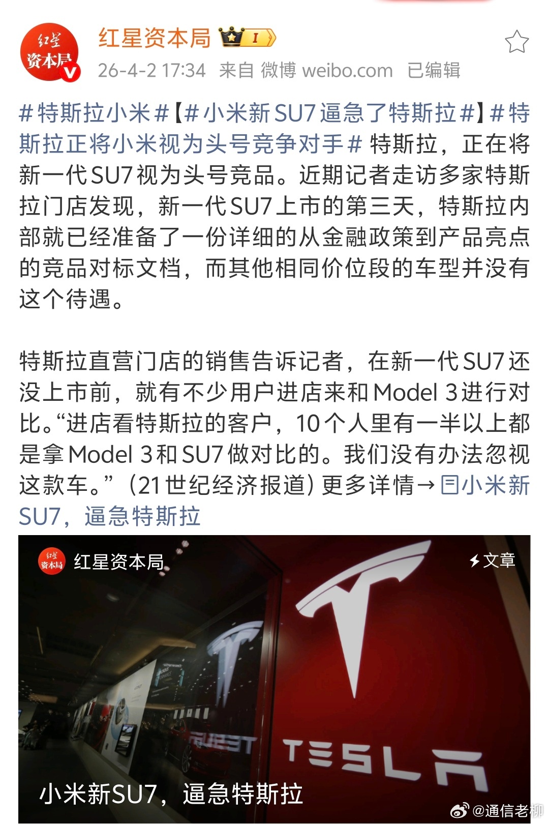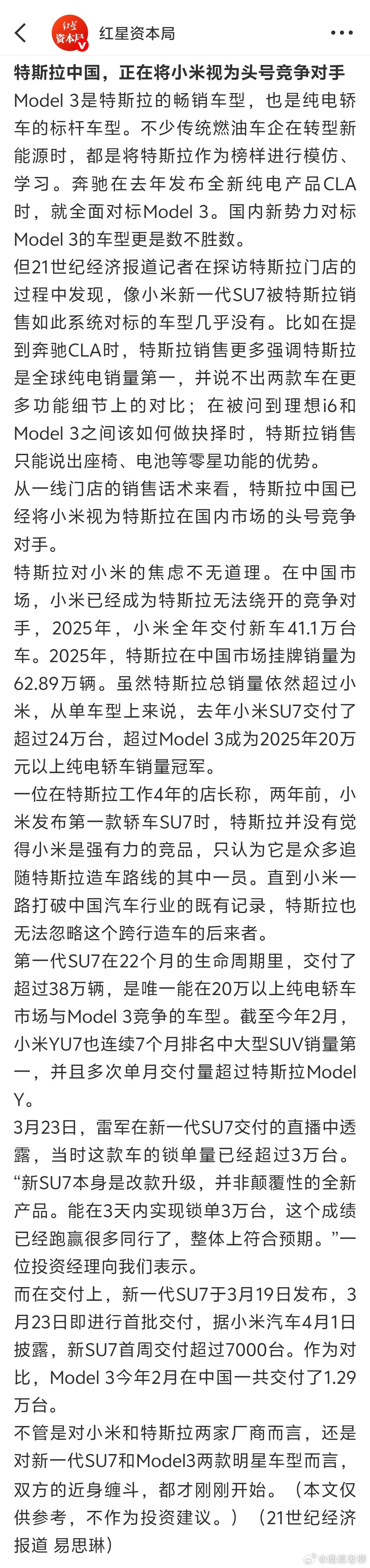 据媒体报道,“新一代SU7上市的第三天,特斯拉内部就已经准备了一份详细的从金融政策到产品亮点的竞品对标文档,而其他相同价位段的车型并没有这个待遇。”有门店表示“进店看特斯拉的客户,10个人里有一半以上都是拿Model 3和SU7做对比的。我们没有办法忽视这款车。”
