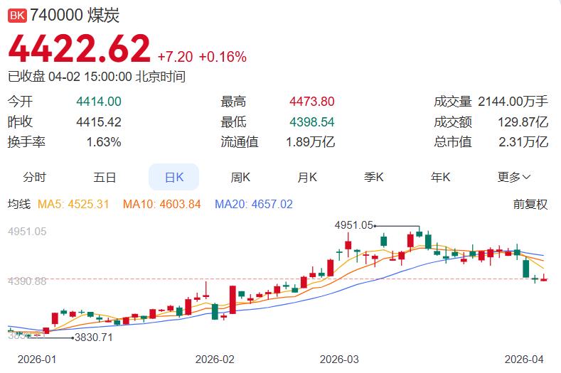 4月2日煤炭板块+0.16%,资金净流出2.84亿元,无涨停股,涨幅靠前的有云煤能源3.75%、中煤能源3.77%、中国神华2.30%、电投能源2.29%、潞安环能2.01%、兖矿能源1.84%、陕西煤业1.46%、陕西黑猫1.35%、新集能源1.33%、山煤国际1.16%,跌幅较大的有江钨装备-3.59%、云维股份-3.32%、新大洲A-2.78%、美锦能源-2.73%、永泰能源-2.21%、恒源煤电-1.74%、淮河能源-1.03%、冀中能源-1.05%、兰花科创0.93%、平煤股份-0.60%。中煤能源今日参加2025年度集体业绩说明会,大秦铁路在互动平台表示国际能源价格上涨或将拉动国内煤炭需求。 今日板块逆市走强,涨幅位居申万行业第三,主要受国际煤价上涨及地缘冲突催化带动。从消息面看,兖矿能源披露2025年商品煤产量创历史新高,高分红与高成长并重的红利特征显著;大秦铁路表态国际能源价格上涨有望拉动国内煤炭需求。板块全天主力资金净流出仅2.84亿元,较前两日明显收窄,其中中国神华获净流入6945万元居首。短期来看,地缘冲突推升海外煤价对国内形成传导支撑,叠加煤炭板块低估值、高股息优势,在当下市场防御风格占优的背景下,板块仍有估值修复空间,可关注龙头公司的配置价值。