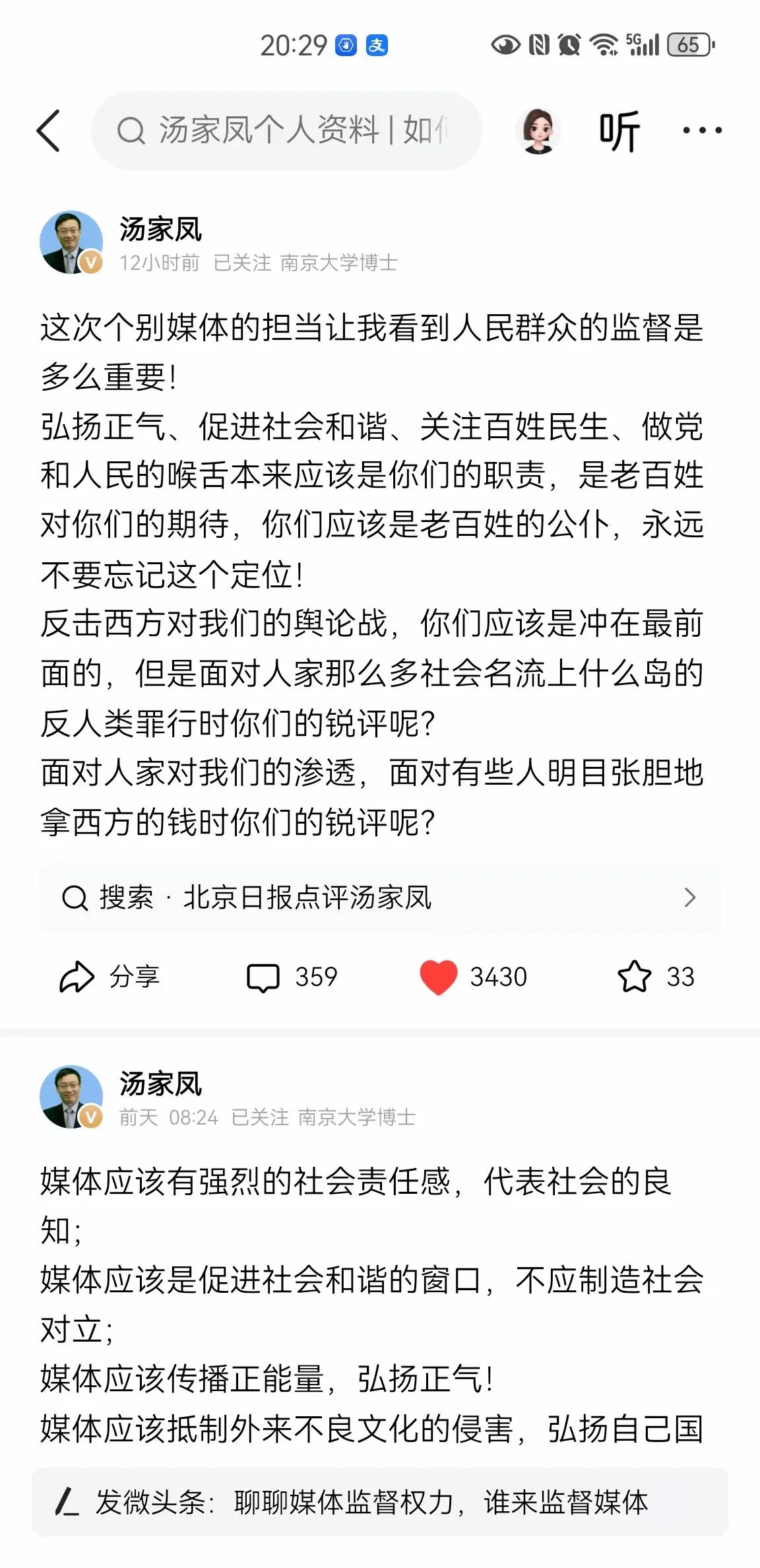汤教授的意思很明确,不能只是被动地被西方舆论带路,更应该对西方的丑陋现实进行揭露和批判,要让国人看到西方政客权贵的丑恶嘴脸,看清西方社会的虚伪和丑陋,比如萝莉岛事件,官方媒体其实也可以出来说说话,这样有利于国人看清西方的本质,增强对本国的自信和热爱。 我们有些人确实被好莱坞电影等一些东西的价值体系攻破了,以至于崇洋媚外,数典忘祖,甚至是非不分,被别人带路,走向歧途,这些不仅民间媒体人要去引导,官媒更应该去引导。