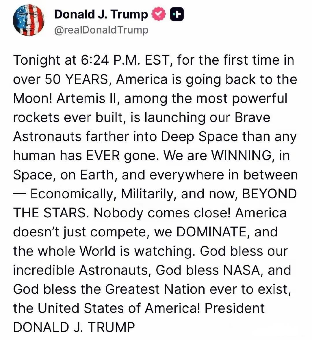 [吃瓜群众]川普,又提前开香槟了…不过有一说一[思考]虽然NASA虎威还在,但绕月飞行也是多少年没玩过了,敢去的人,确实是真的猛士[6]