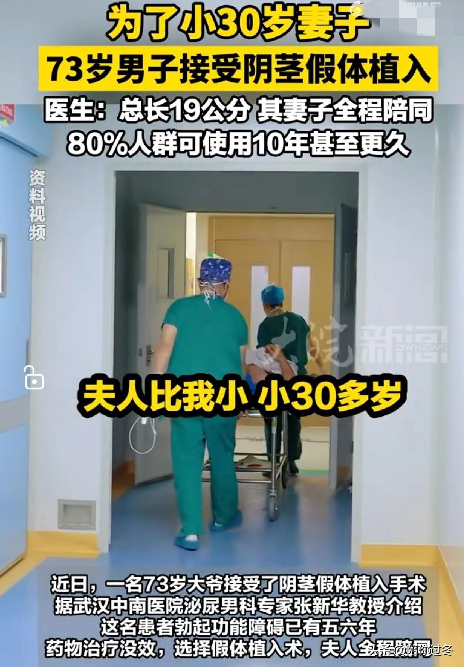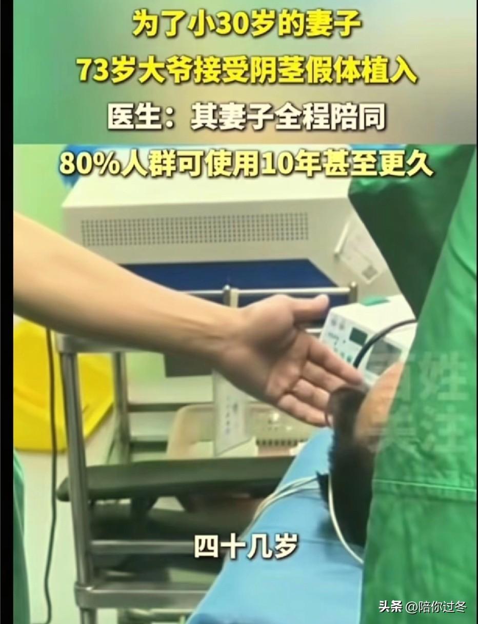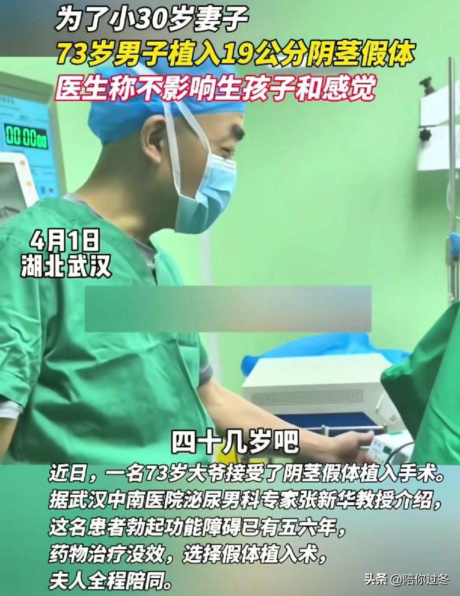 73岁男子植入19公分阴茎假体! 为了娇妻也是拼了呀!大爷73岁,妻子40多岁,勃起功能障碍有6年了,夫妻两人经过研究决定,植入19公分阴茎假体,保质期大概10年左右! 近日,一名73岁的大爷,为了爱妻的幸福生活,也是狠心了,选择做植入19公分阴茎假体手术,登上热搜。 据武汉华南医院张教授透露,这名患者勃起功能有障碍已经有五六年了,药物治疗也尝试了,但没有效果,所以只能选择了植入手术,手术当天他的妻子还全程陪护。 此外,医生还介绍假体总长度为19公分,外露11公分,手术康复后,不影响夫妻生活,没有异样的感觉,也不影响生孩子,看样子老大爷还能再展“雄风了”! 也有不少网友调侃,大爷对妻子绝对是真爱,愿意为对方付出一切,太有担当了! 其实话又说回来了,在身体健康允许的情况下,尝试着去改变自己,毕竟老年人也有爱情,也需要提高生活质量呀! 大家对此怎么看?阴茎假体植入术