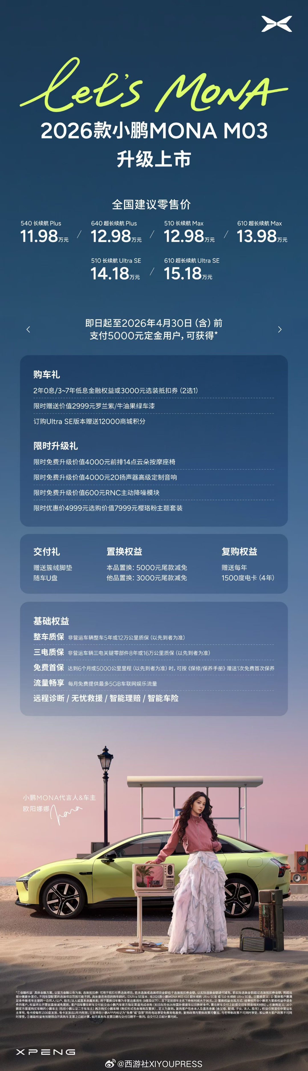 2026款小鹏MONA M03重磅首发权益,以满满诚意让年轻人轻松拥有心仪座驾。全新罗兰紫、牛油果绿两款高级质感车漆,原2,999元,限时免费;同级唯一20扬声器AI音响+RNC主动降噪,原4,600元,限时免费;同级唯一前排14点云朵按摩座椅,原4,000元,限时免费;米其林轮胎+运动轮毂套餐限时选装价仅4,000元;樱珞粉专属主题套装,原7,999元,限时仅4,999元;同步推出上市专属权益,即日起至2026年4月30日24点前下定2026款小鹏MONA M03,限时送至高价值超35,000元权益。欧阳娜娜同款小鹏MONA起售价11.98万2026款小鹏MONA大大大大大升级