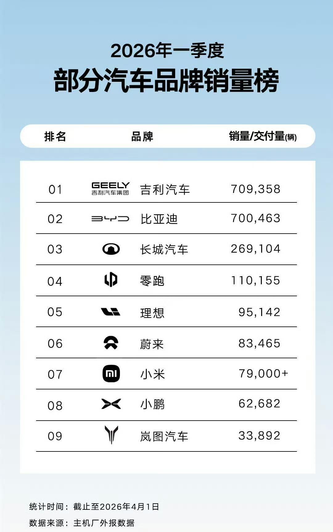 吉利超越比亚迪,成为一季度销冠。虽然吉利一季度总量领先,但3月份比亚迪已重回第一(迪子30.02 万台vs 吉利23.30万台),进入二季度,车市也逐渐进入旺季,比亚迪的垂直整合能力和规模效应通常会在年中至年底释放,届时格局大概率会再次变化。 大家怎么看?