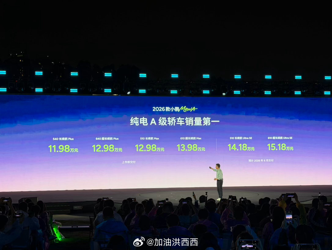 2026款小鹏MONA M03升级了音响、隔音、主动降噪、热泵空调、电机、座椅、辅助驾驶、车机系统、颜色、内饰等等等等,能想到的都升级了,11.98-15.19万,我最喜欢13.98的610超长续航max,续航和辅助驾驶基本上让姐妹放心了!2026款小鹏mona大大大大大升级欧阳娜娜开新款MONA冒雨参加发布会欧阳娜娜代班何小鹏发布会讲车欧阳娜娜同款小鹏MONA起售价11.98万2026款小鹏MONA今日上市