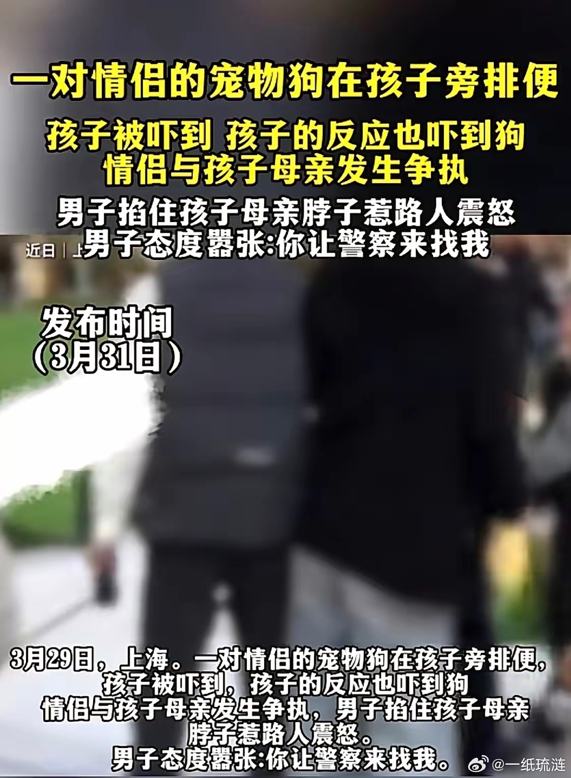 上海一对小情侣在人来人往的商业街区遛狗不栓绳,纵容狗子随地大小便,吓到别人家小孩子后不仅不道歉,还口出恶言说什么“你的孩子是孩子,我的狗也是我的孩子”与被吓到孩子妈妈大声争吵,其中男子还有用手掐宝妈的脖子,试图抢夺路人手中拍照的手机等行为,最终在围观群众的指责声中仓皇逃离。宝妈报警后警方最终因为男子打人(掐脖子)行政拘留7天,女子遛狗不拴绳加不清理狗子大小便罚款几百元,后续应该还有赔偿宝妈医疗费,孩子精神损失费等费用!
