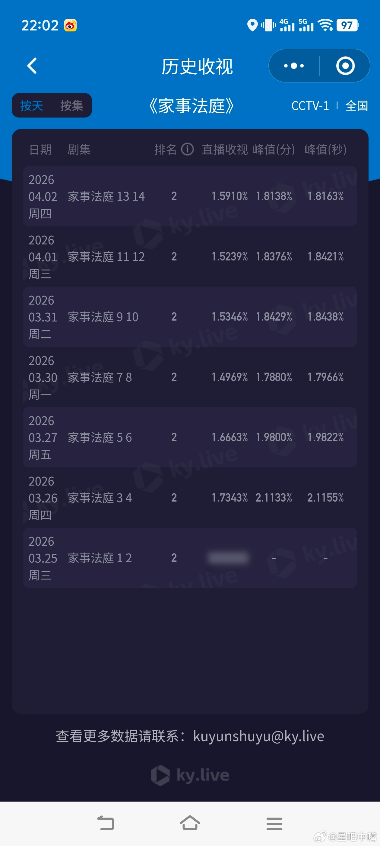 家事法庭 今晚收视回涨了,双集平均1.5910!还不错,较昨日小涨!今晚cvb估值:1.5910×1.91=3.039