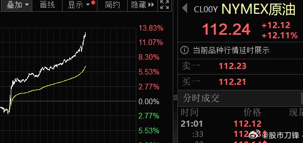 今晚原油又涨疯了,WTI原油期货大涨12%,报112美元/桶;布伦特原油期货大8%,报109元/桶。