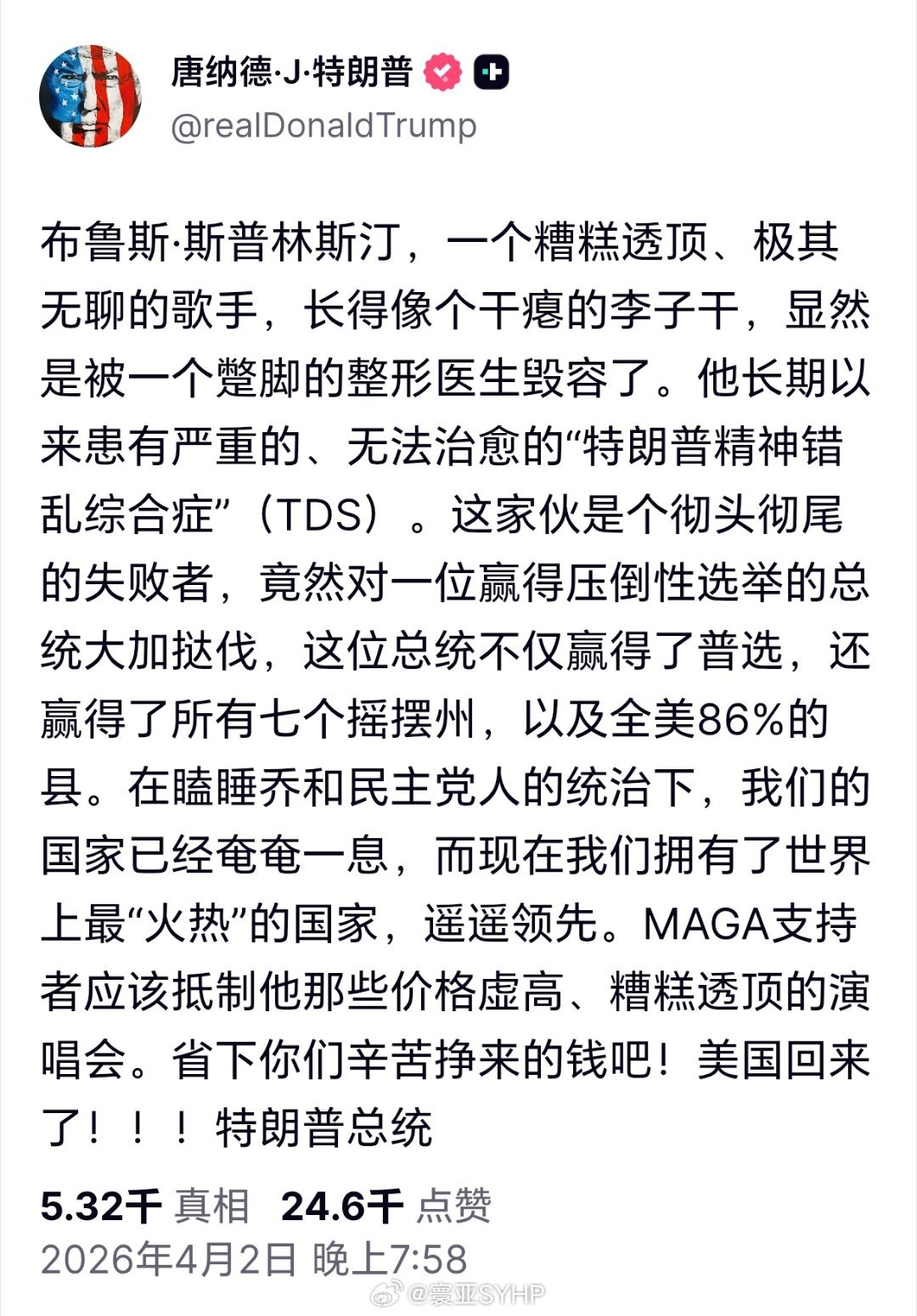 特朗普称斯普林斯汀长得像个干瘪的李子干特朗普报复心极强,发文称美国著名歌手布鲁斯·斯普林斯汀是一个糟糕透顶、极其无聊的歌手,长得像个干瘪的李子干。