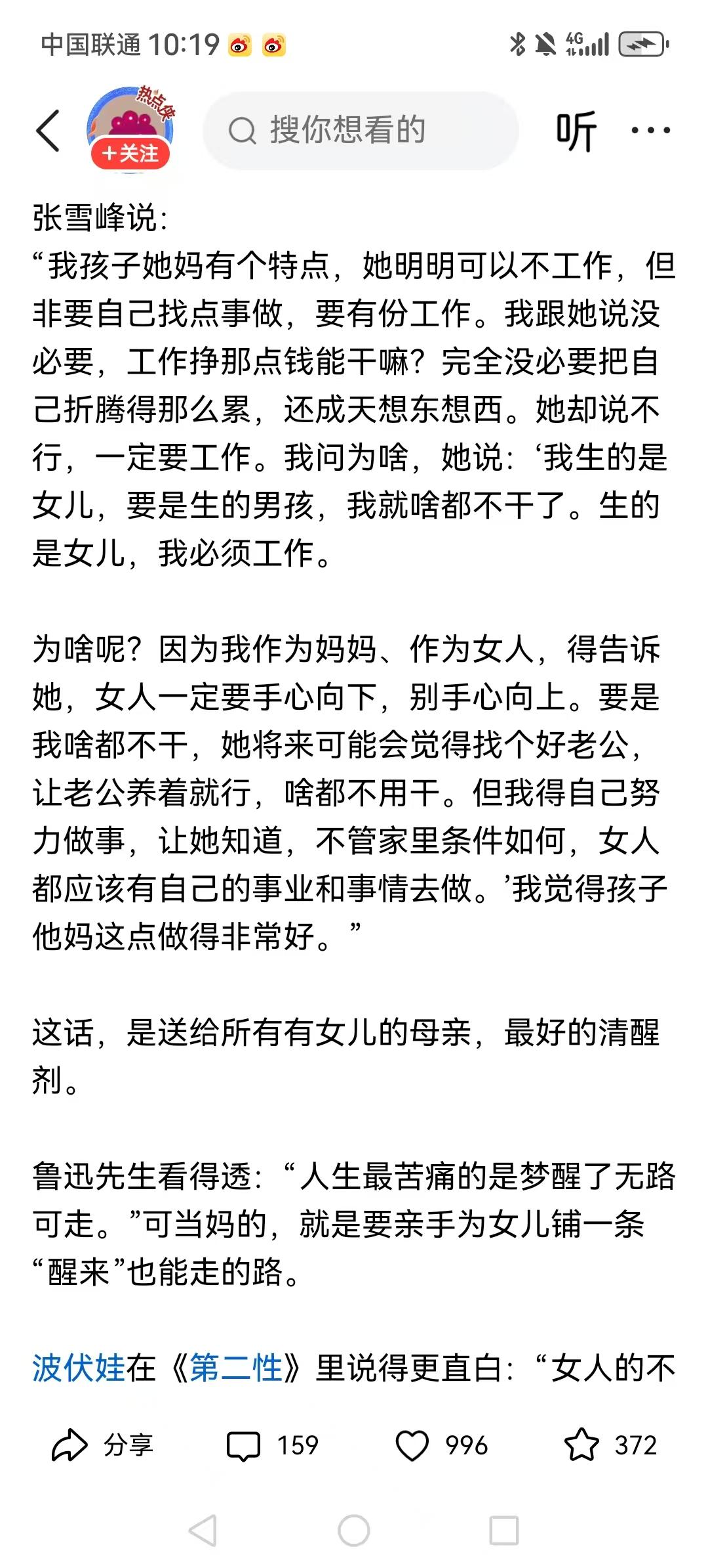 张雪峰老婆这觉悟绝了!明明可以享福却非要工作,就是为了让女儿知道女人要有自己的天地,这才是顶级的母爱。 我一直支持女儿不要放弃工作,现在自己也能每年赚一百多万了,和女婿的收入越来越靠近了。 与其折腾别的,不如好好照顾张雪峰老师,给他做做饭、打理好生活,这下倒好,直接成独立女性了。 其实妻子完全可以辞去工作,跟张雪峰一起经营公司,管好张老师的饮食起居,可以雇一个保姆做饭,照顾好张雪峰,公司也会越来越好! 老婆绝对不合格,最起码的饮食起居要安排好吧,母亲的独立是女儿最好的榜样,言传身教远胜千言万语。 我觉得女性可以独立,但是条件好的也可以早点退休,找点自己喜欢的事情做,不一定非得上班。