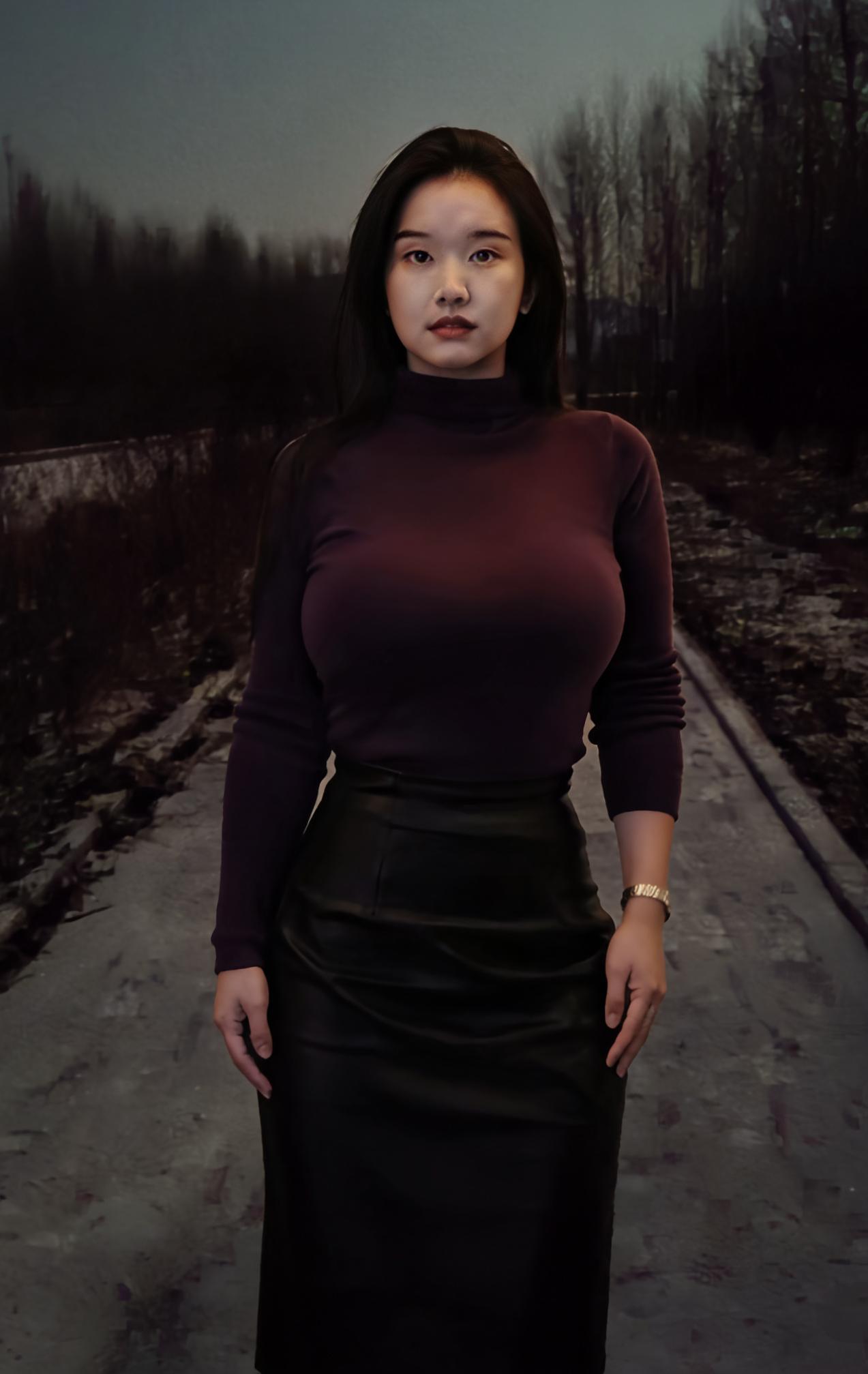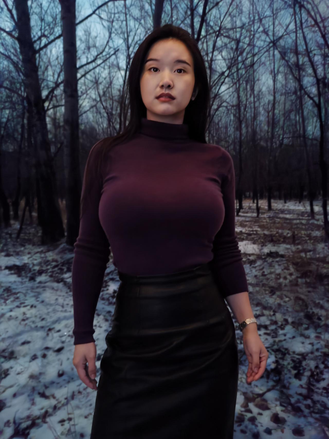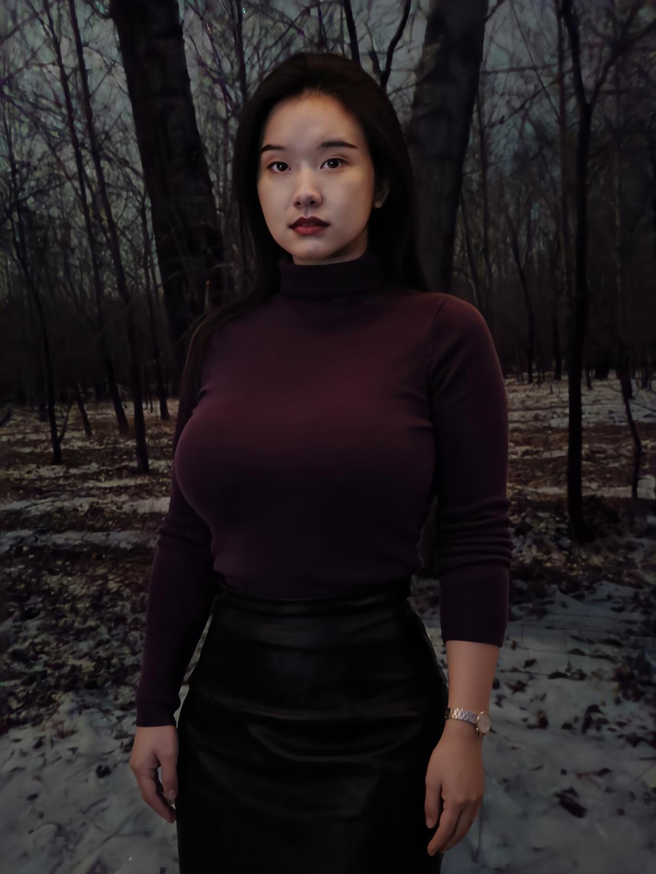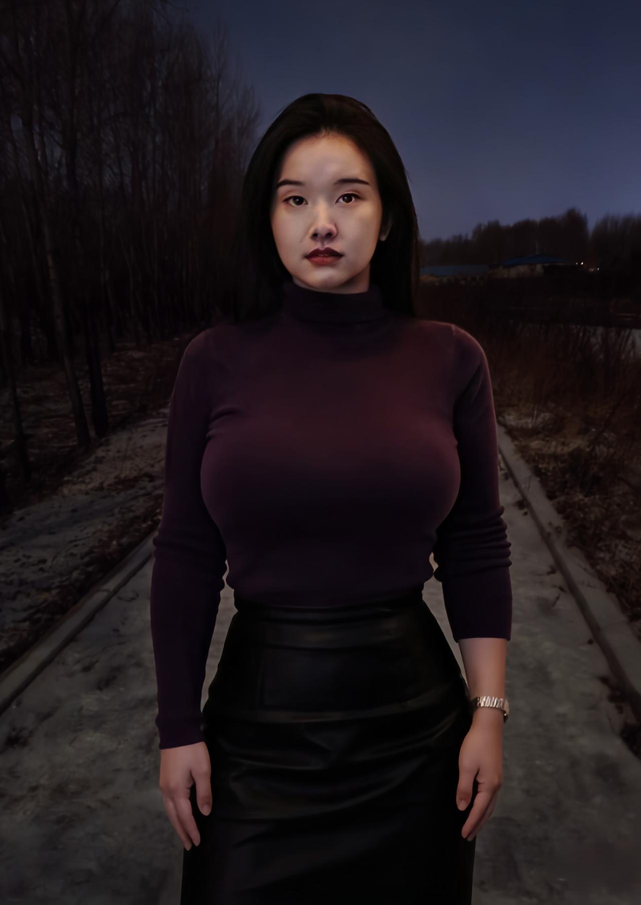 暮色漫过荒径的肩,从天际的褶皱里漫落, 像一匹褪了色的锦缎,轻轻覆住枯草的窝。 霜花在枯枝间凝作浅白的烟, 每一粒冰晶都藏着冬的私语,不肯言说。 ~ 她立在冬夜的边缘,身影与暮色相融, 紫褐的高领裹着温软的骨, 黑裙垂落,像夜未散开的帘, 扫过脚边的霜土,留下一道浅淡的痕。 ~ 腕间的银饰沉在暗里,却亮过天边未熄的星点, 那是她指尖未说的言,是藏在沉默里的暖。 风掠过枯草丛的呜咽,拂过她垂落的发, 发丝轻扬,又轻轻落下,不疾不缓。 ~ 那风里裹着冬的凉,也裹着春的盼, 吹不散她眼底凝住的渊,那渊里无波无澜, 却盛着世间的软与坚,盛着无人懂的孤单。 ~ 不是怯,是冬野赋予的静敛, 像寒夜里扎根的木,把锋芒藏进枝干,把温柔藏进根须。 不是冷,是暮色揉进的暖, 是她站在风里,却把温度留给了路过的影。 ~ 荒径向远方蜿蜒,像一条未写完的线, 她站成冬夜最韧的节点,把寒夜的寂,织成温柔的绵。 每一寸轮廓都浸着安然,每一次呼吸都带着从容, 在霜风里,不慌不颤,在暮色里,自成一景。 ~ 她没有言语,却比言语更有力量, 她没有盛装,却比盛装更显芬芳。 冬夜的风再狂,吹不散她的影, 霜华再厚,也覆不住她的光。 原来最美的模样,从不是张扬的盛放, 而是于寂寂冬野里,站成自己的暖阳。