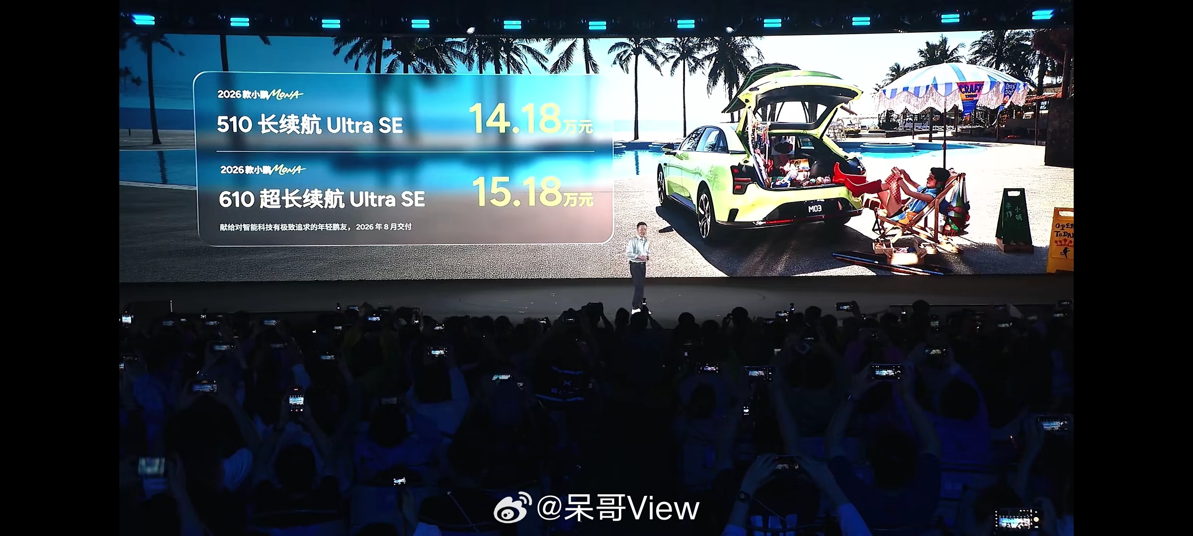 Ultra SE版拉到14.18万和15.18万,配置据说大大大大大升级,看来小鹏这个定价真没给友商留活路啊。欧阳娜娜同款小鹏MONA起售价11.98万2026款小鹏MONA大大大大大升级