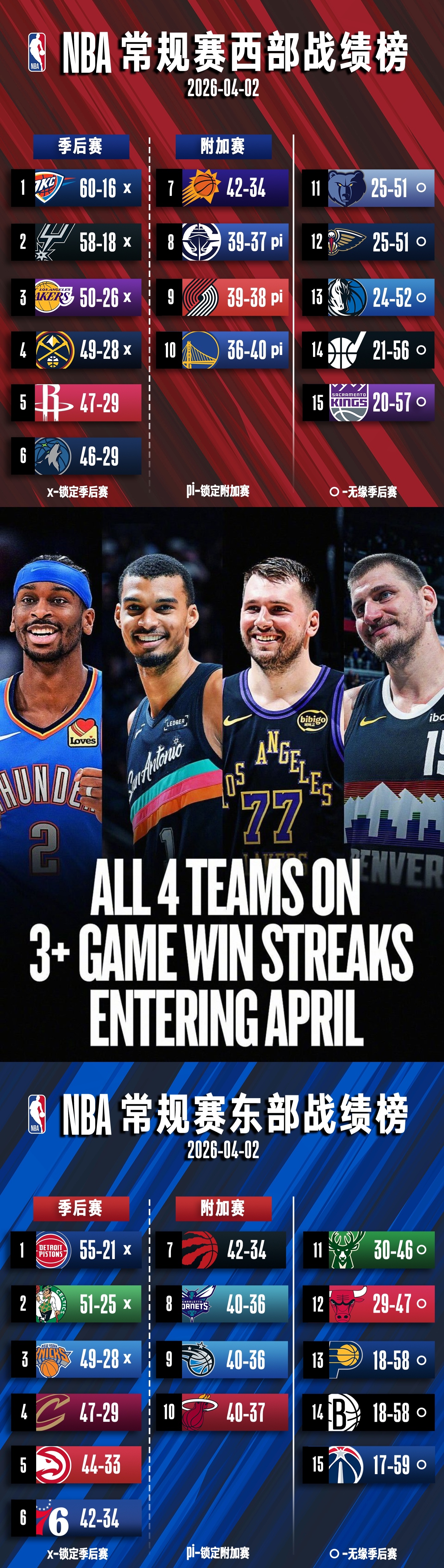 现在骑士49胜,尼克斯50胜,在尼克斯后面四连败的情况下,尼克斯就保持50胜了,
