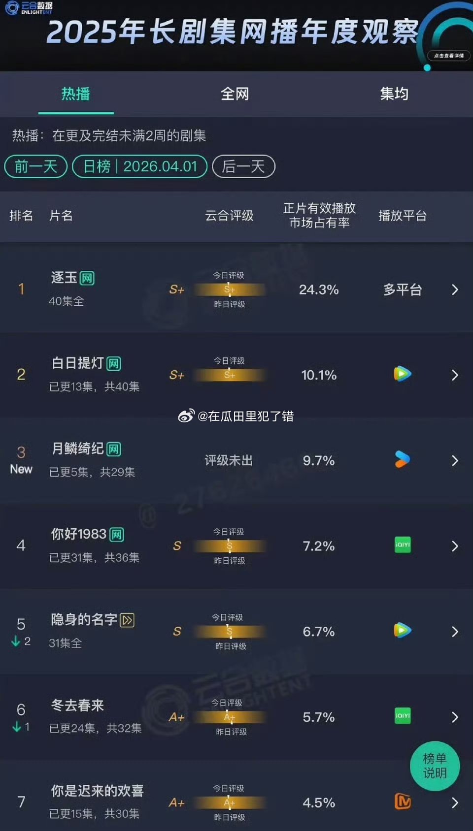 昨日云合前三名🈶逐玉、白日提灯、月鳞绮纪