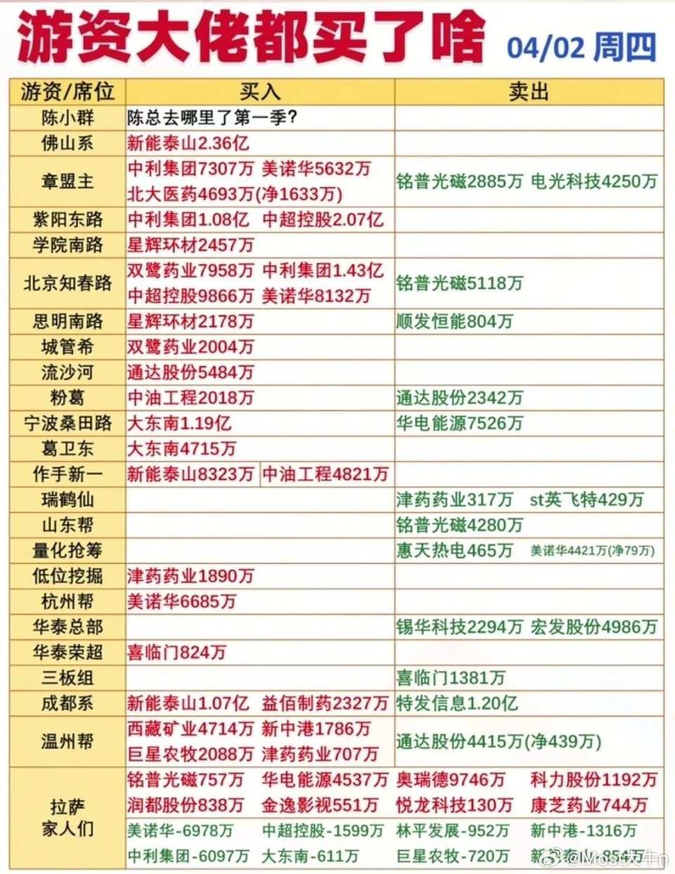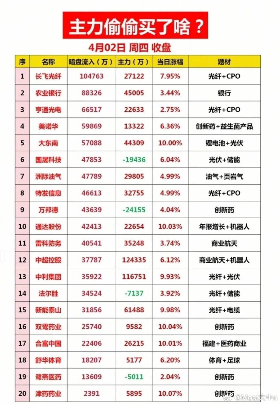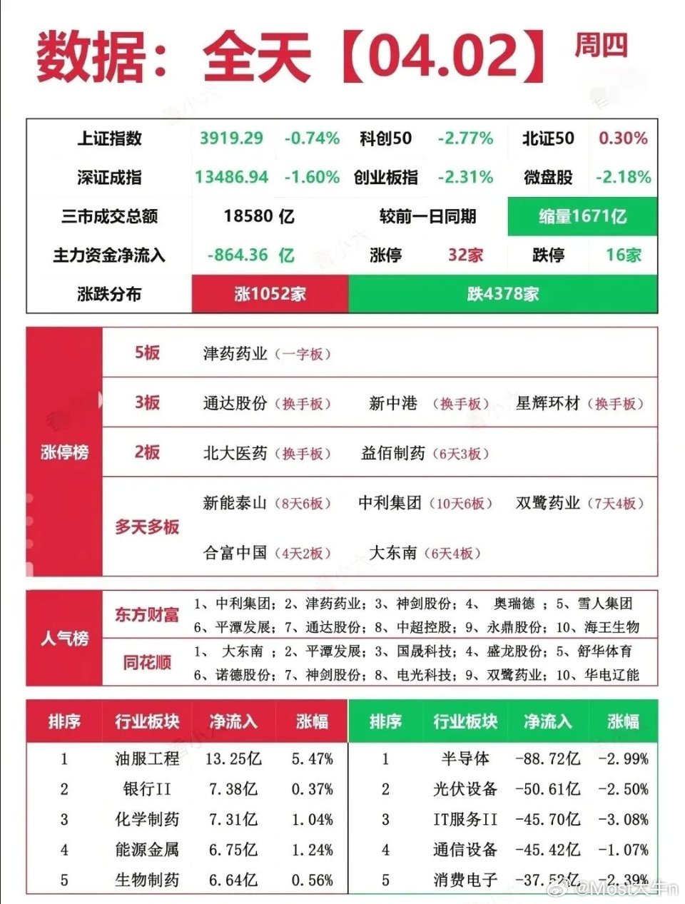 资金调仓换股,主线轮动加速!板块与个股端尽显博弈热度:主力资金流向呈现明显分化,油服工程、银行、化学制药等板块获资金净流入,半导体、光伏设备、IT服务等板块则遭资金大幅净流出;个股层面,中超控股、中利集团、新能泰山等成为主力资金追捧焦点,阳光电源、华工科技等则面临资金撤离。游资动向同样暗藏玄机,陈小群、章盟主、作手新一等知名游资席位现身龙虎榜,新能泰山、中利集团、大东南等核心标的成为游资博弈主战场。连板梯队中,津药药业晋级5板,通达股份、星辉环材等拿下3板,医药生物、电力设备、电子等板块成为连板核心阵地,连板个股的表现也勾勒出当前市场的核心情绪主线。在市场缩量调整、板块轮动加速的背景下,资金围绕主线反复博弈,后续需关注主力资金流向与游资情绪变化,把握市场轮动节奏。