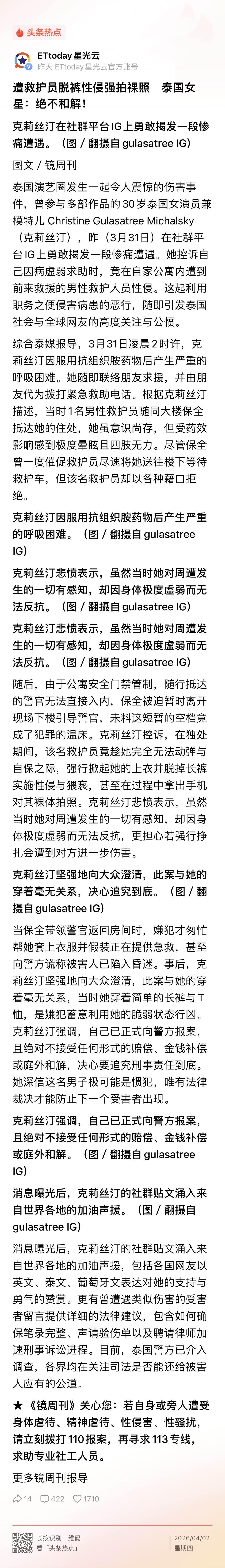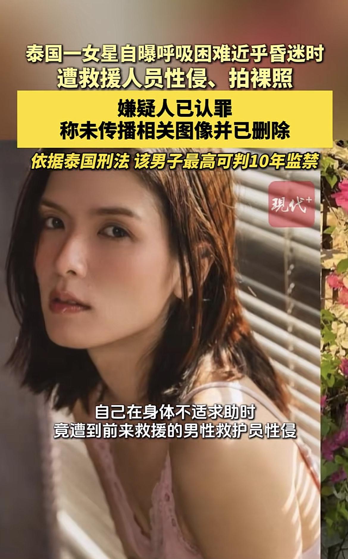 泰国女星自爆呼吸困难近乎昏迷时,遭救护员脱裤性侵、拍裸照。表示:绝不和解! 竟然发生这样的事儿!施救病人演变为实施性侵!应该严惩不贷! 女星 泰国