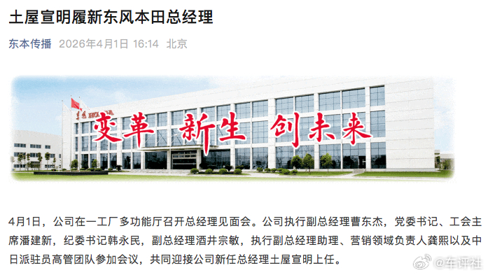 汽车人事变动 【新总经理上任!东风本田官宣】4月1日,东风本田宣布,土屋宣明接替渡边丈洋出任总经理职务,当天公司在一工厂多功能厅召开总经理见面会,宣布新任总经理土屋宣明上任。市场上关于土屋宣明的介绍并不多。官方表示,土屋宣明于2001年加入本田技研工业株式会社,先后在日本本田总部、广州等地工作,在事业战略、商品及市场战略以及成本企划等诸多领域有丰富的工作经验。车评观察