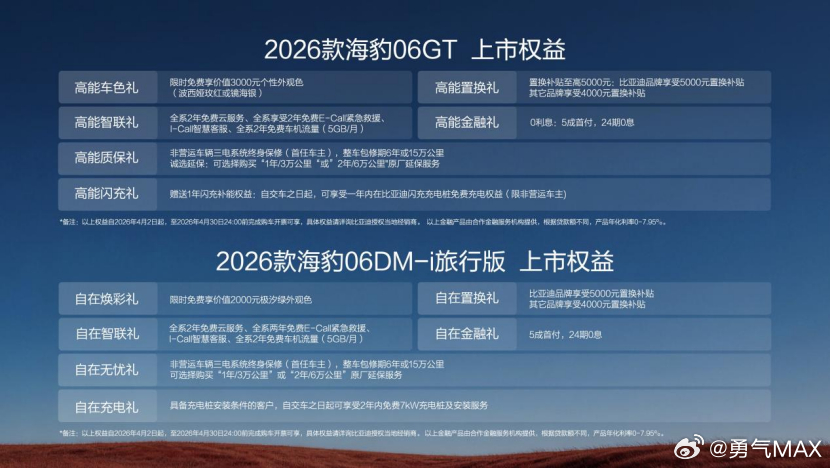 今天下午,比亚迪海洋网一下推出了两款新车,分别是2026款海豹06GT和2026款海豹06DM-i旅行版,一起正式上市了。其中,海豹06GT的官方指导价在12.89万到16.99万之间,旅行版更实惠,11.19万起售,最高也才13.99万。两款车都有购车、选装、养护相关的权益,海豹06GT用户还能额外享受1年闪充补能权益,能让车主用车更省心。海豹06GT主要面向年轻人,搭配了比亚迪的闪充技术和第二代刀片电池,最高纯电续航能到620公里,充电时能实现“5分好,9分饱”,哪怕是零下30度,也只是多花3分钟。动力方面,它的电机最大功率提升到了240kW,百公里加速仅需6.5秒,开起来很有劲儿。智能配置上,搭载了带激光雷达的DiPilot-300辅助驾驶系统,支持城市和高速领航辅助,还配备了DiLink 150智能座舱,平时开着既顺手又安全,颜值也有新增配色,很符合年轻人的审美。