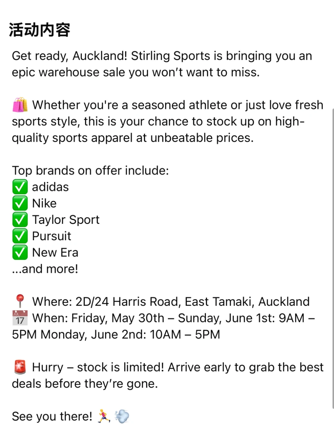 奥克兰的朋友们,准备好啦!斯特林体育用品店即将为您带来一场不容错过的大型仓库清仓大甩卖。以超值价格囤积高品质运动服装的好机会~折扣低至3折![哇R][哇R]