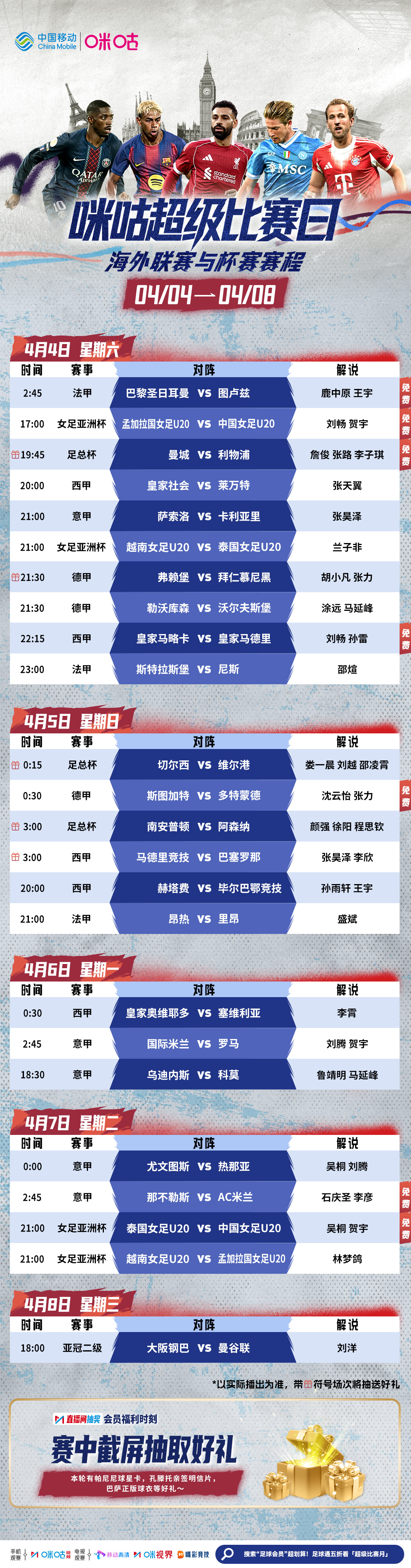 ⚽️ 咪咕超级比赛日𝟰.𝟰-𝟰.𝟴🔥 U20女足小组赛剩余两场⚔️ 曼城利物浦足总杯硬碰硬🏟 马竞巴萨将迎来多次交锋👀 #看足球上咪咕# 网页链接