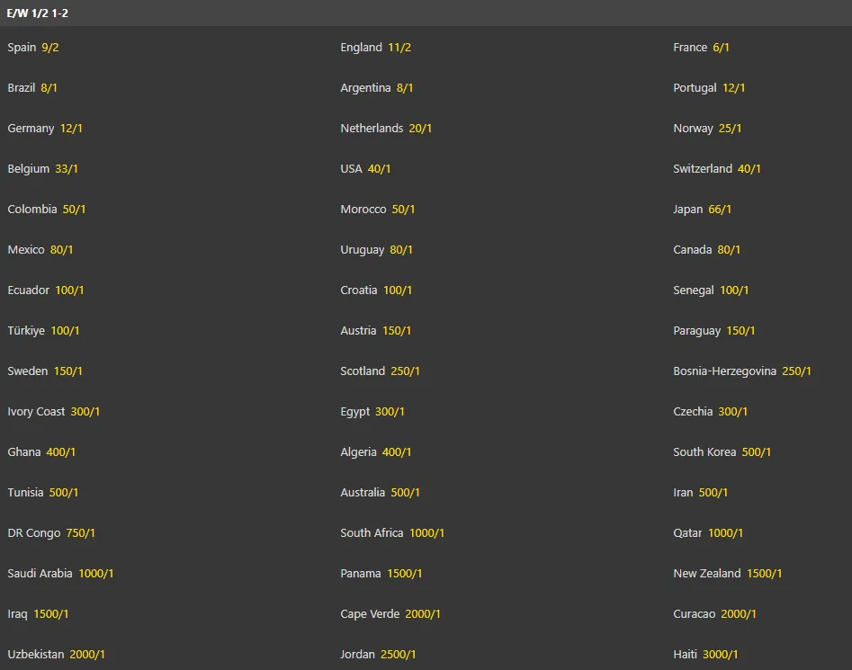 【我买1万海地赢】本届世界杯最新夺冠赔率:西班牙2赔9成最大热门,海地1赔3000垫底。