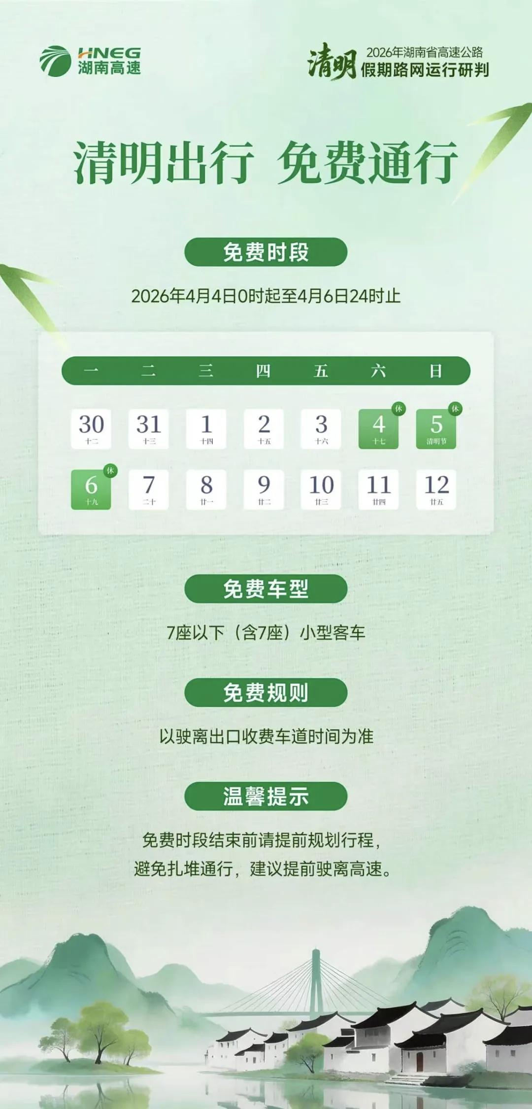 2026年清明假期临近,湖南省高速公路集团有限公司正式发布2026年清明假期高速公路出行服务指南,为公众假期祭扫、踏青出行提供全面精准的出行指引与全链条服务保障。 本次清明假期为期3天,全省高速公路将对7座及以下小型客车实施免费通行政策,免费时段为2026年4月4日0时至4月6日24时,免费通行资格以车辆驶离出口收费车道的时间为准,公众可据此合理规划行程节点,充分享受免费通行政策。 结合历年清明假期路网运行规律与当前公众出行需求综合研判,2026年清明假期湖南省高速公路出入口总流量预计将达1575万辆。受假期免费政策、清明祭扫传统出行与春日踏青休闲出行需求叠加影响,假期全省高速路网车流将维持高位运行,预计每日出行高峰集中在9时至11时,返程高峰集中在15时至19时,建议公众错峰安排出行计划,避开拥堵时段与路段。 针对假期公众出行的核心需求,湖南高速同步完善了多项服务保障举措,全力护航公众畅行假期。补能服务方面,提前完成全省高速公路服务区充电设施的全面检修与维护,保障新能源车辆出行补能顺畅;保通保畅方面,将强化路网全时段实时监测与应急值守,及时发布动态路况信息,快速处置各类突发状况,为公众避堵出行提供实时指引;同时,结合省内春日踏青热门目的地的分布情况,同步梳理了沿线高速通行指引,助力公众便捷抵达踏青点位,安心享受春日出行时光。 湖南高速同时提醒广大出行公众,假期出行请提前关注实时路况信息,合理规划出行路线与时间,自觉遵守交通规则,安全文明驾驶,共同维护安全有序、畅通高效的高速公路通行环境。